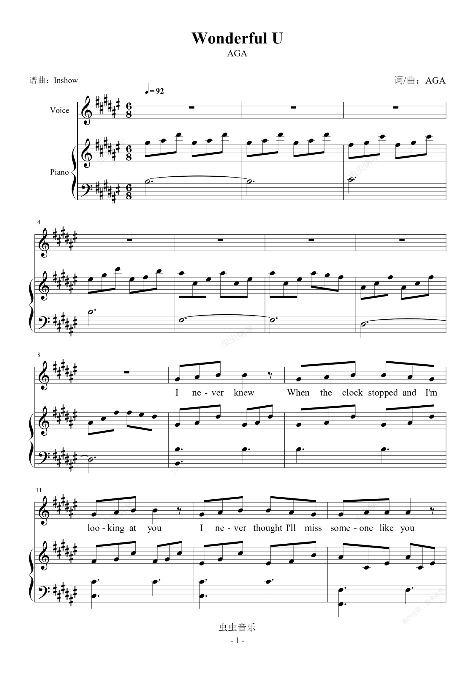 钢琴谱:AGA - Wonderful U【弹唱谱】