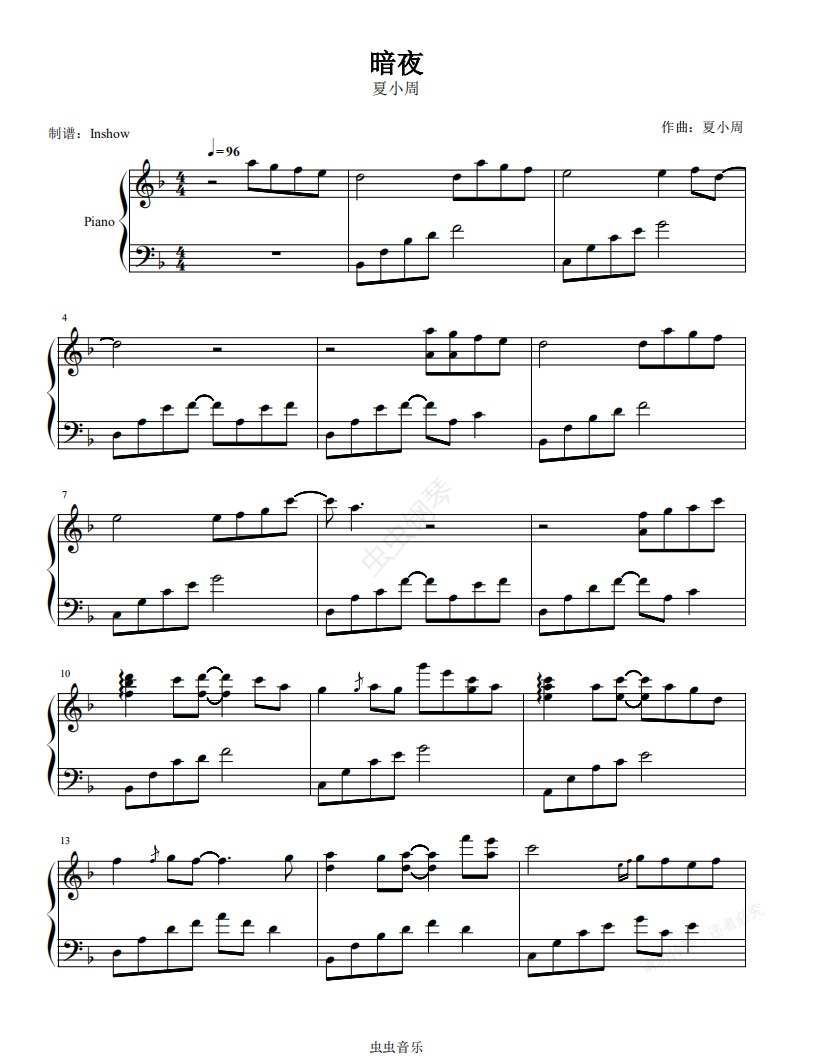 钢琴谱:夏小周 - 暗夜【纯音乐钢琴谱】