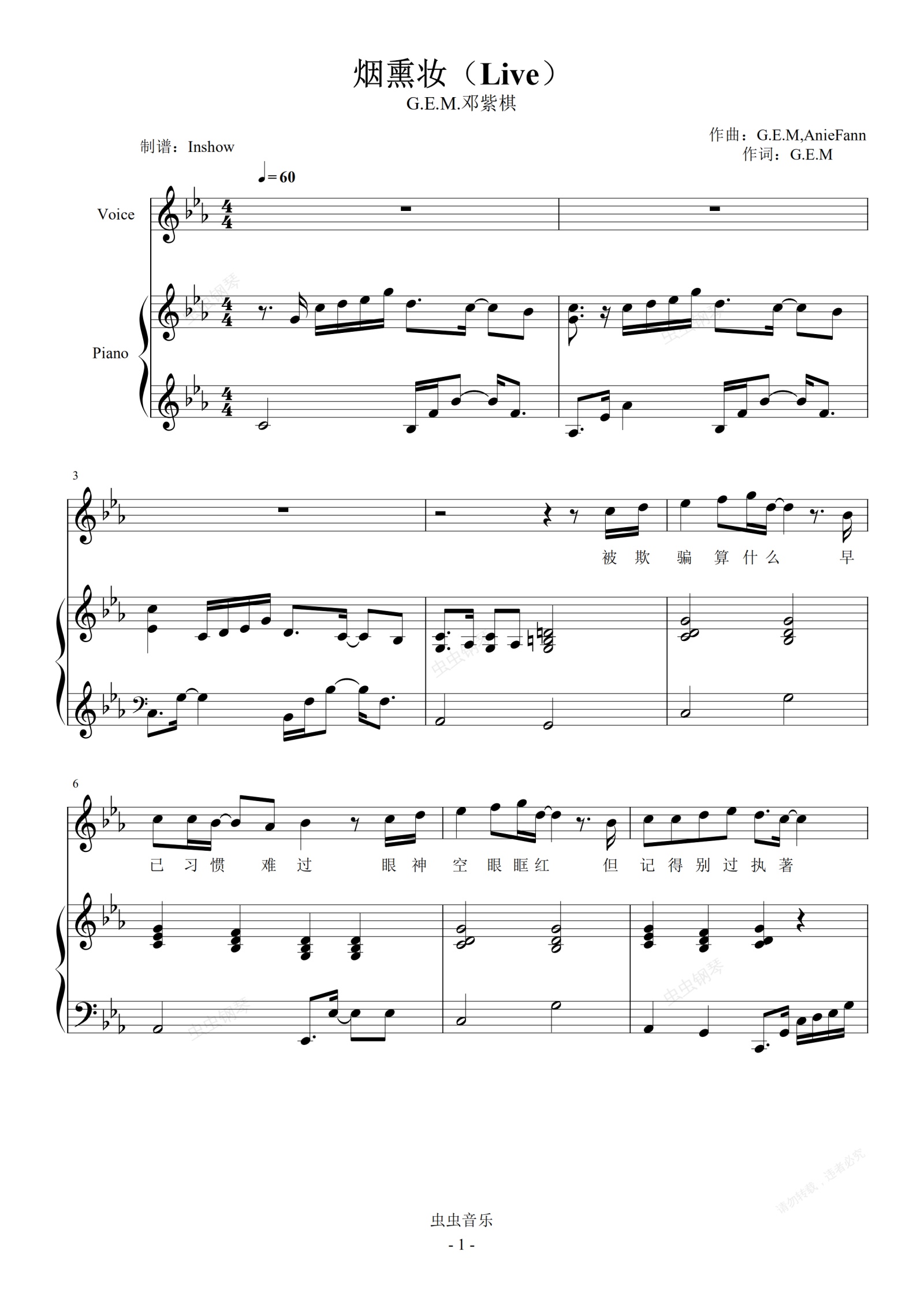 钢琴谱:G.E.M.邓紫棋 - 烟熏妆(Live)【弹唱谱】