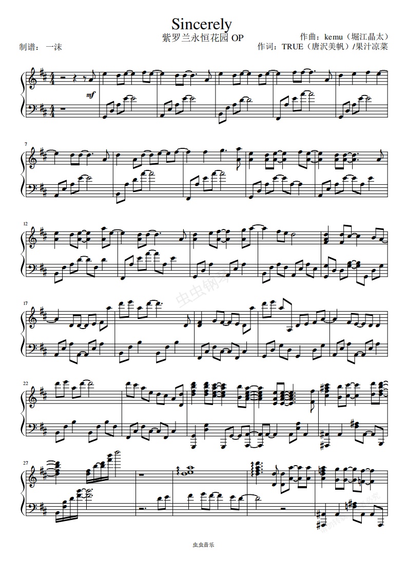 钢琴谱:紫罗兰永恒花园OP 简单 唯美独奏