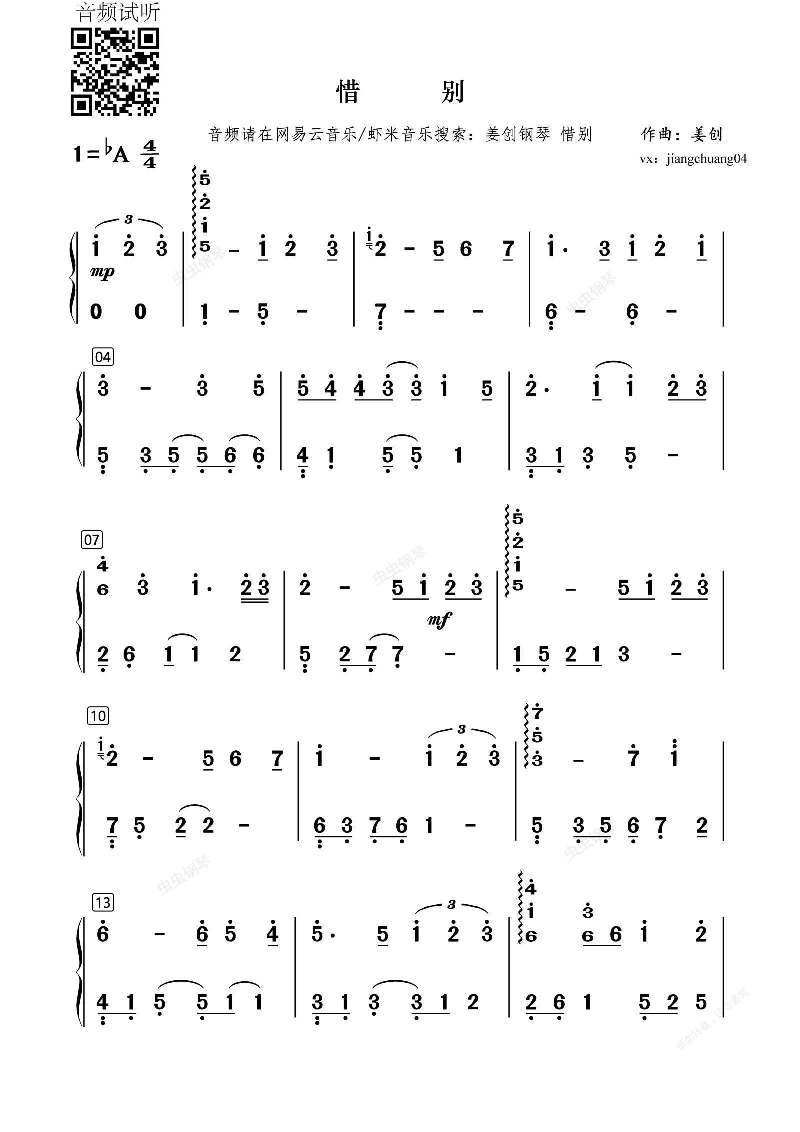 钢琴谱:《惜别》姜创原创钢琴曲简谱版