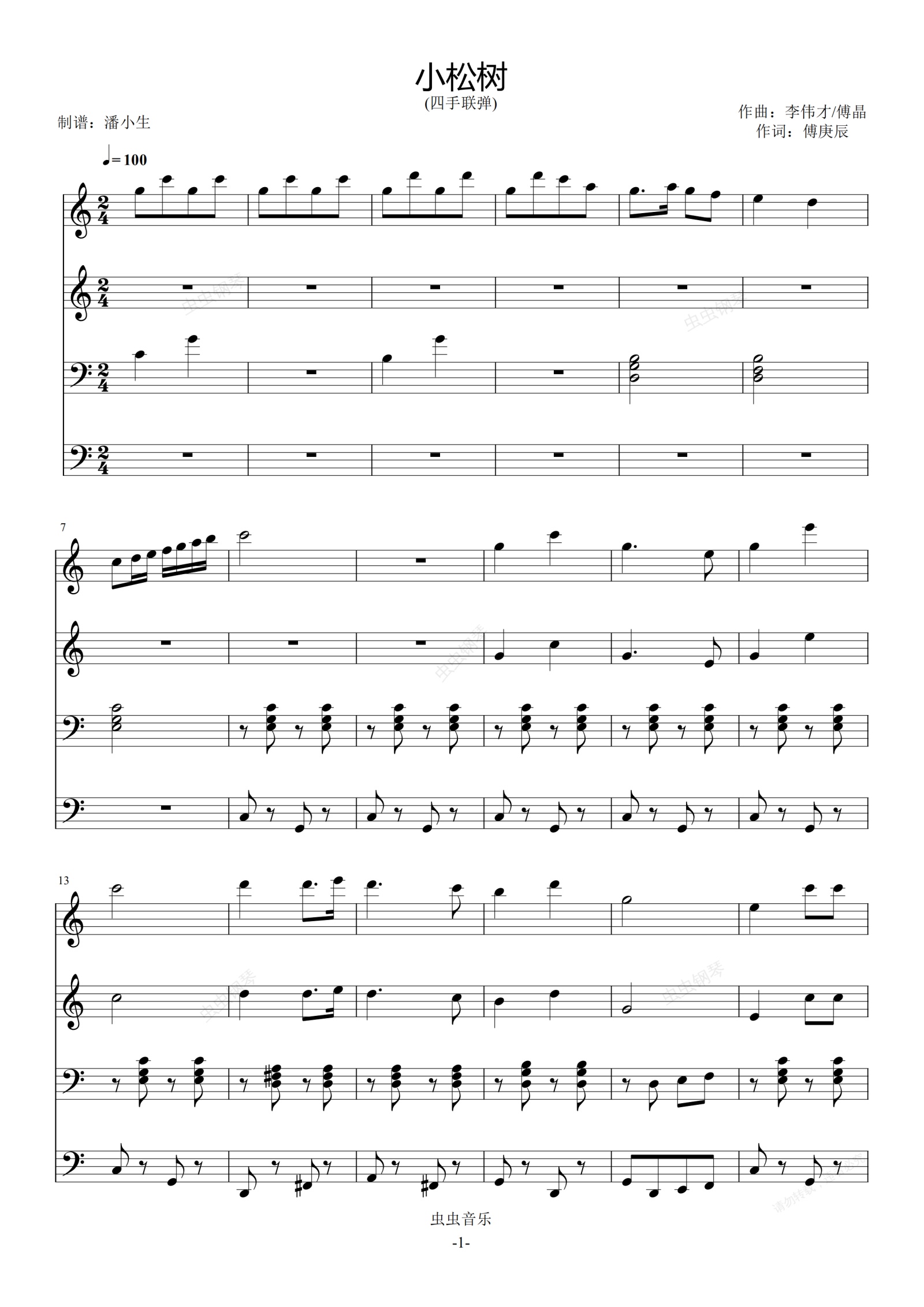 钢琴谱:小松树 四手联弹 儿歌 C调 简单版