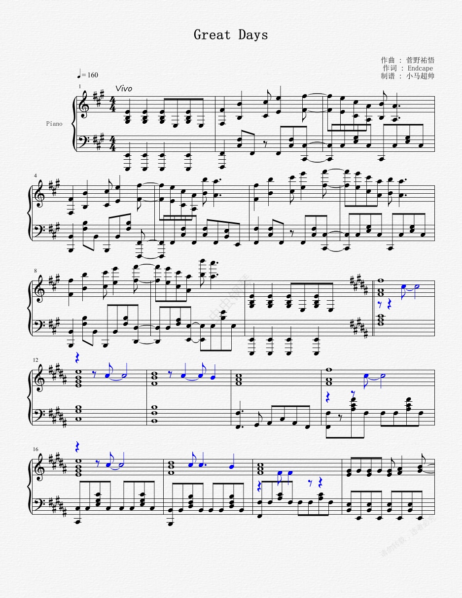 钢琴谱:Great Days - JoJo's Bizarre Adventure : Diamond Is Unbreakable OP 3 Remake
