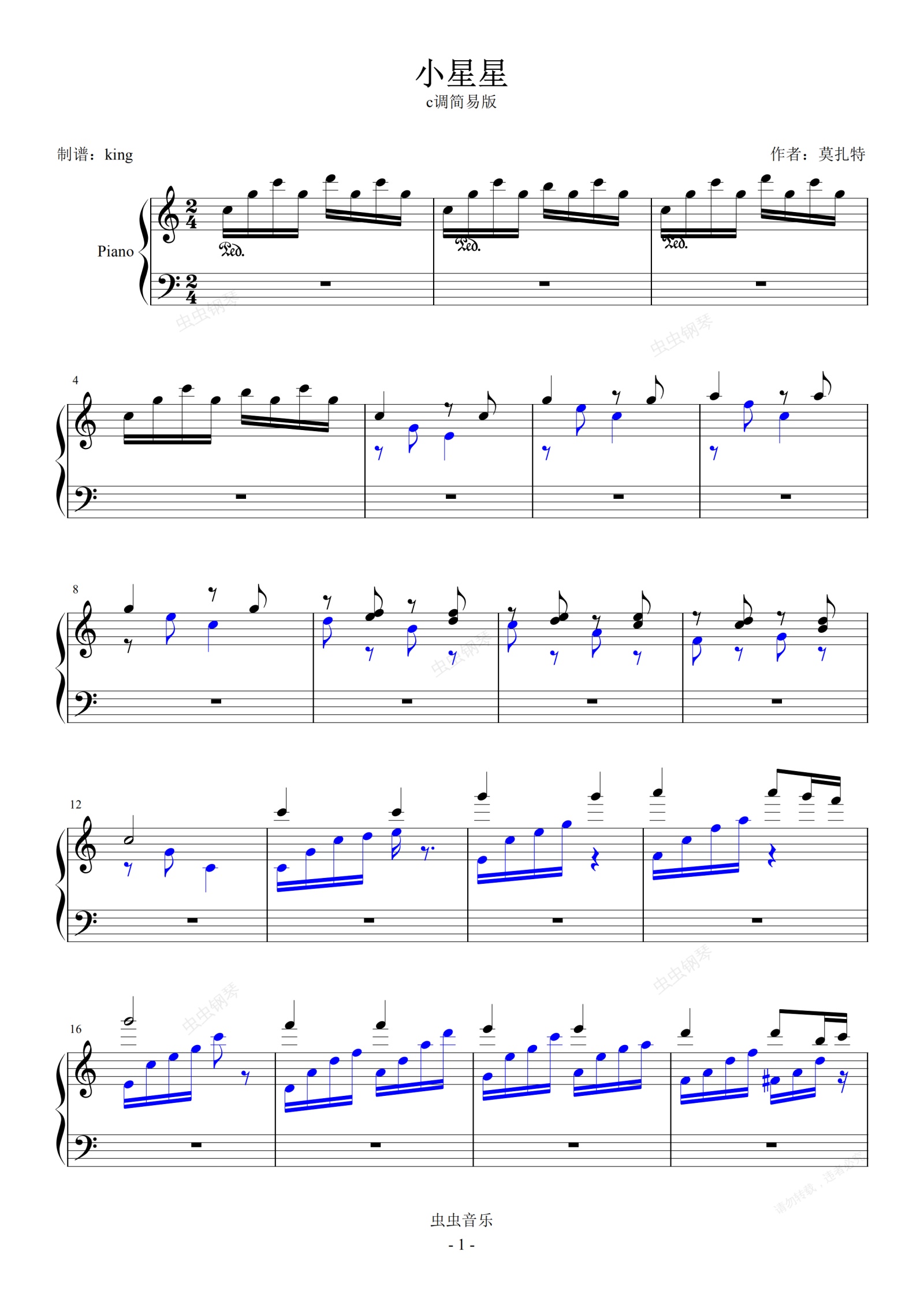 钢琴谱:小星星 完美简易C调 好听 附乐谱演奏音频