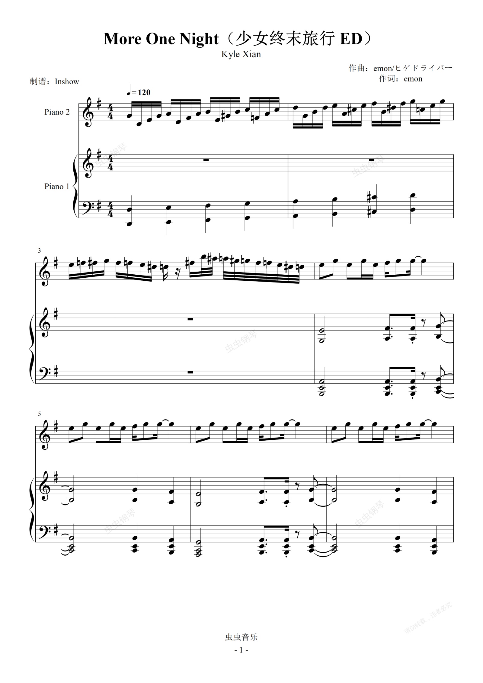 钢琴谱:Kyle Xian - More One Night(少女终末旅行 ED)【独奏谱】