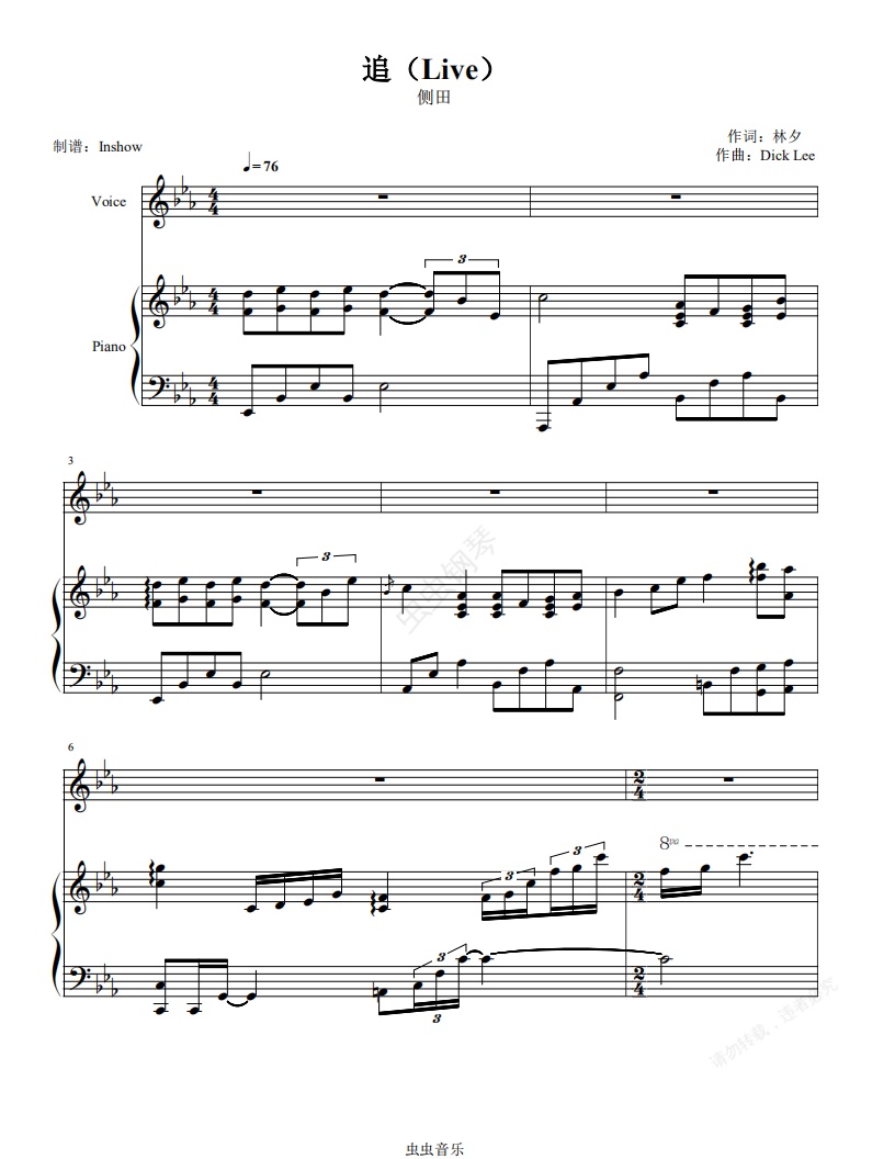 钢琴谱:侧田 - 追(Live)【弹唱谱】