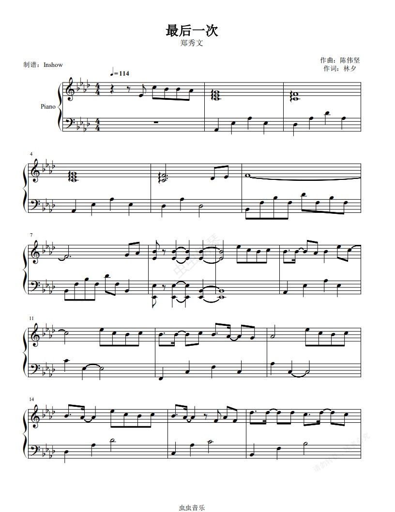 钢琴谱:郑秀文 - 最后一次【独奏谱】