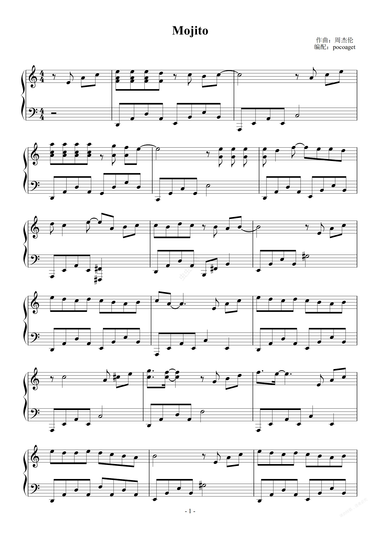 钢琴谱:周杰伦《mojito》初学者优美版(poc编配)