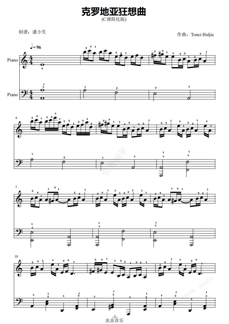 钢琴谱:克罗地亚狂想曲 完整指法 C调 简化版 适合初学者