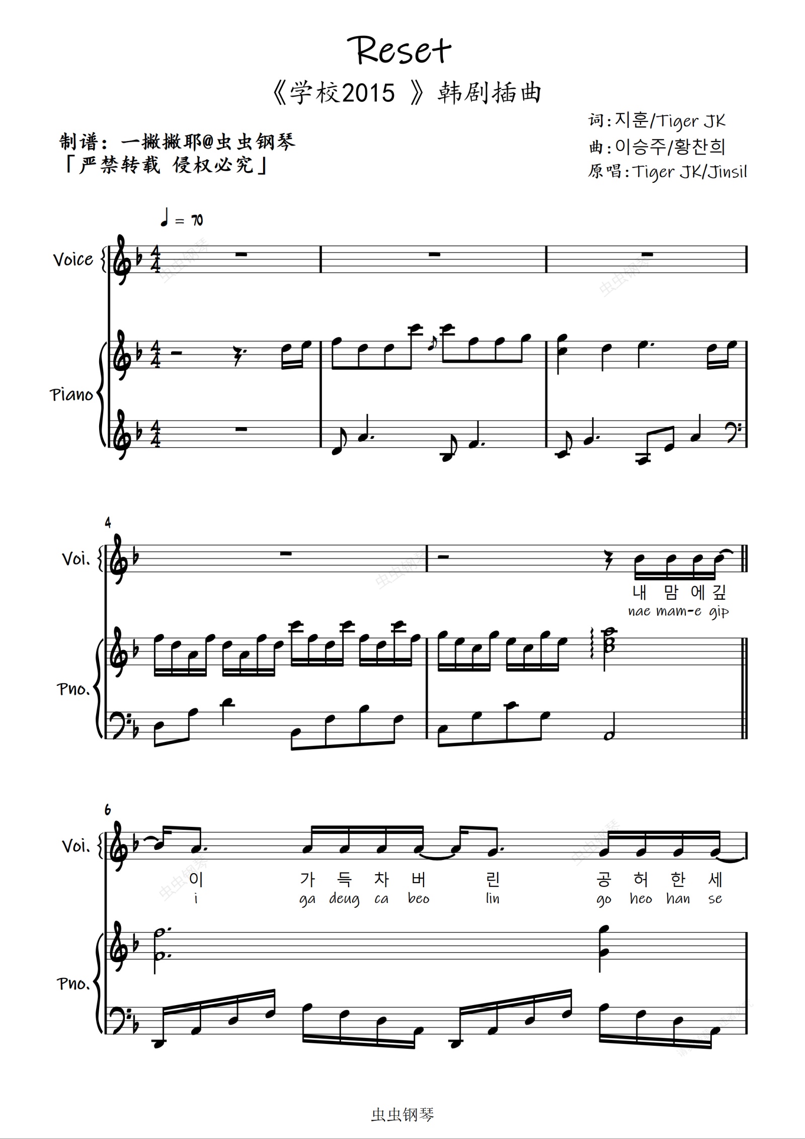 钢琴谱:Reset【弹唱谱(附罗马音歌词)】Tiger JK/Jinsil《学校2015》「一撇撇耶」