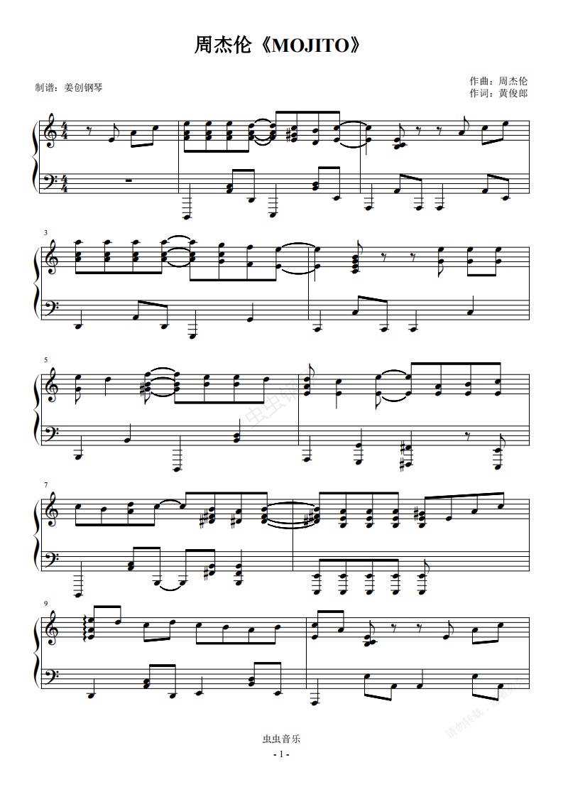 钢琴谱:周杰伦《MOJITO》完整版 完美演奏版