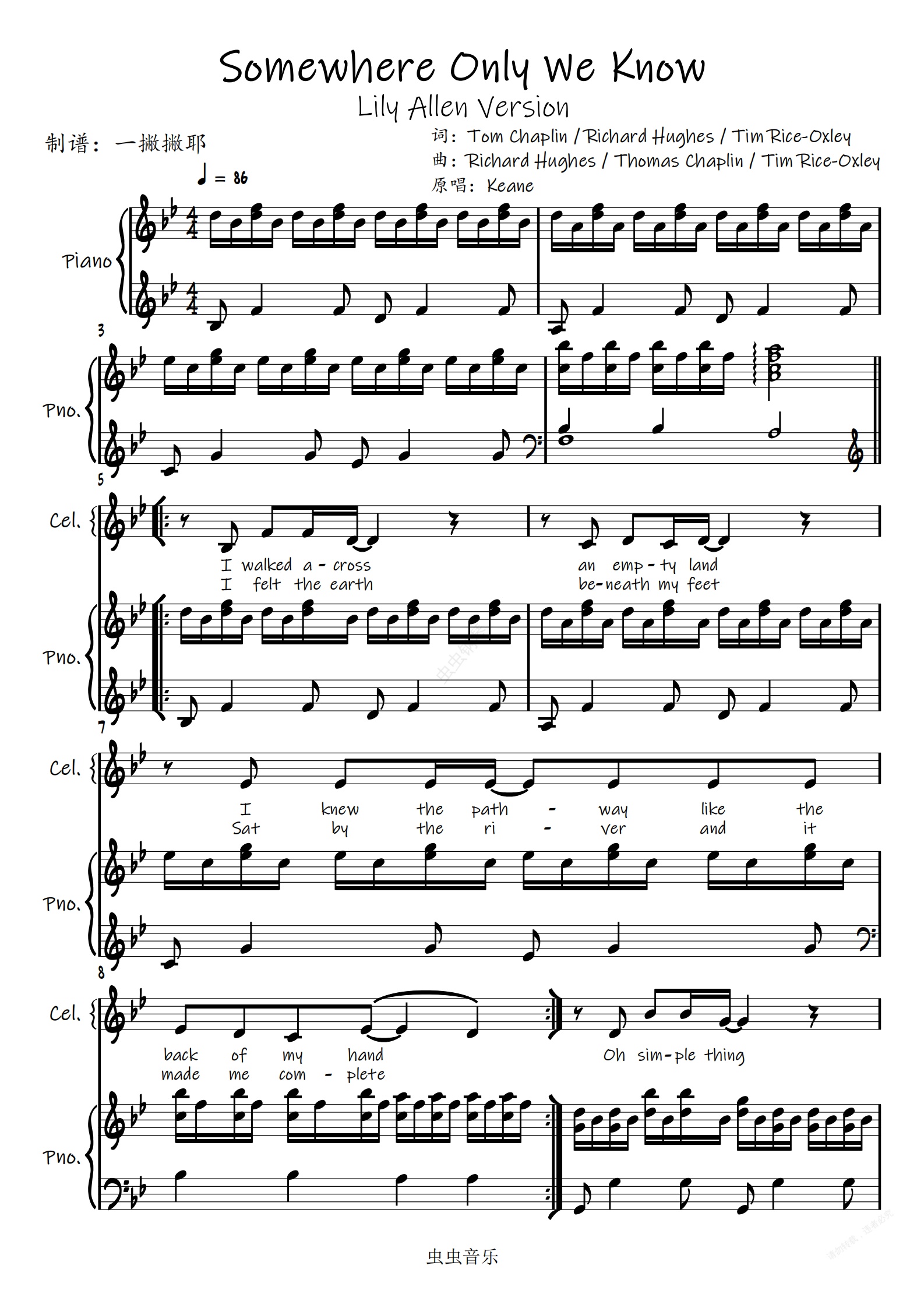 钢琴谱:Somewhere Only We Know【弹唱谱】Lily Allen∣Keane「一撇撇耶」