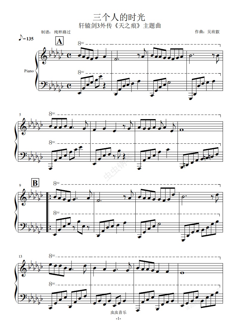 钢琴谱:【纯粹】三个人的时光《天之痕》完美版