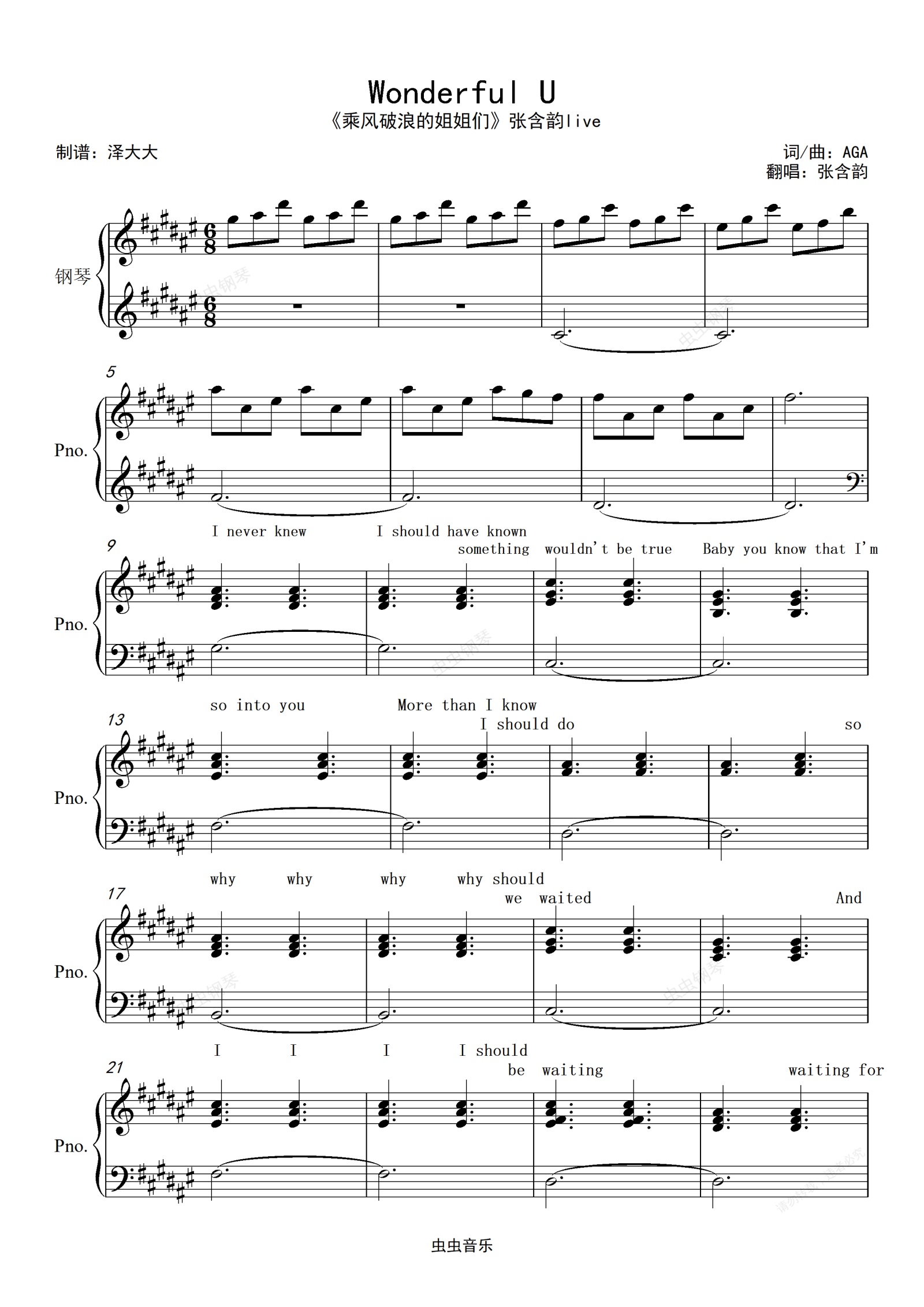 钢琴谱:Wonderful U【张含韵版伴奏附词】