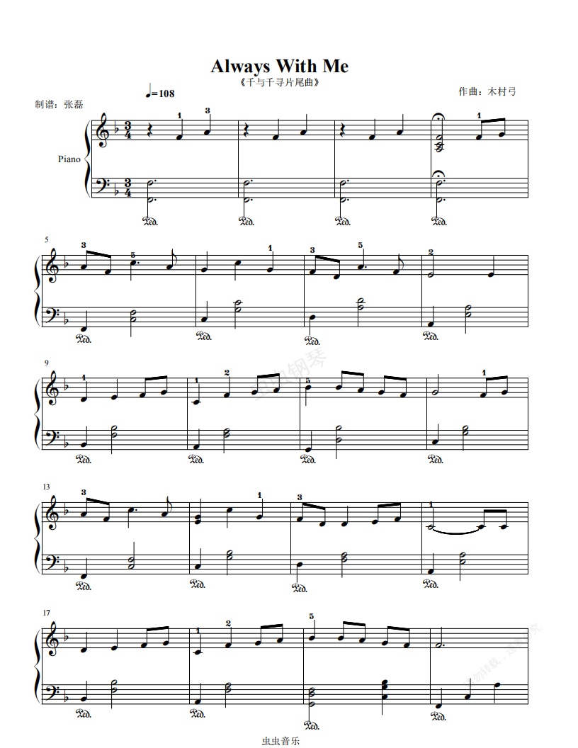 钢琴谱:Always With Me千与千寻--木村弓---F大调