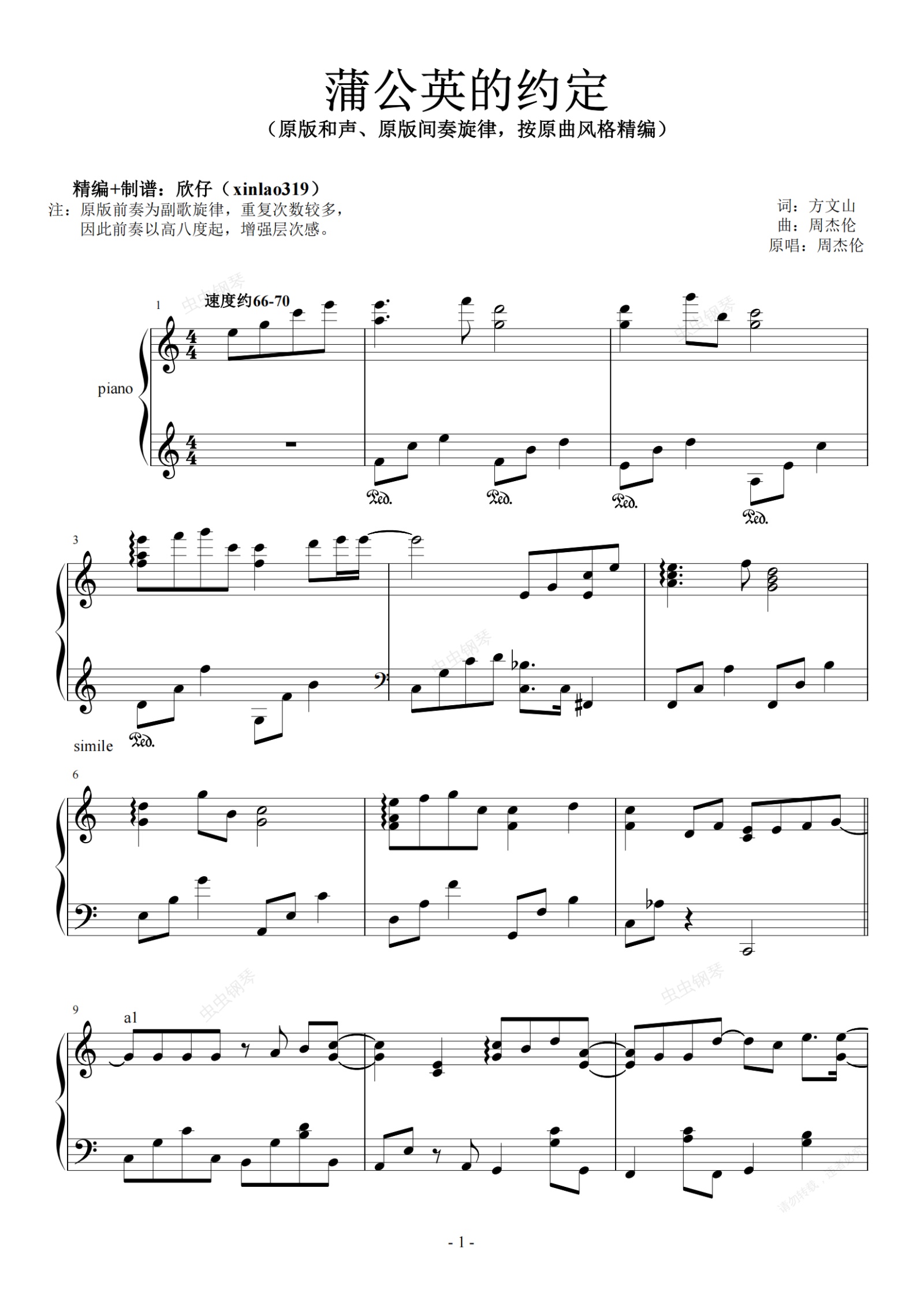 钢琴谱:蒲公英的约定(原版和声+原版间奏+精编完整版)