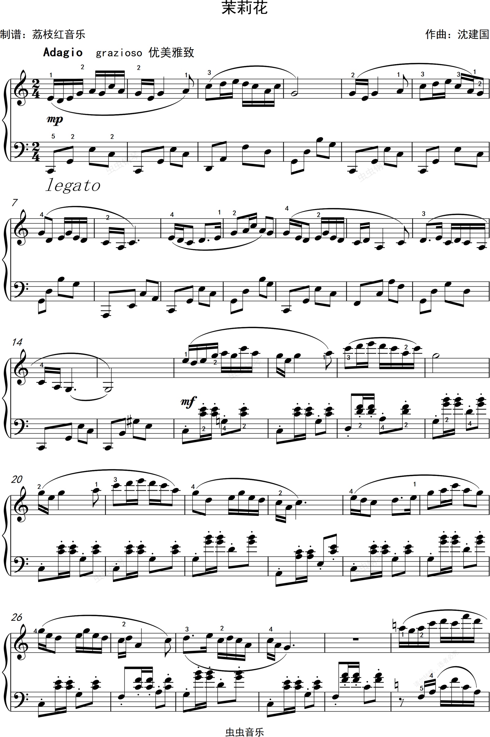 钢琴谱:茉莉花 C调钢琴谱+示范音频 沈建国版