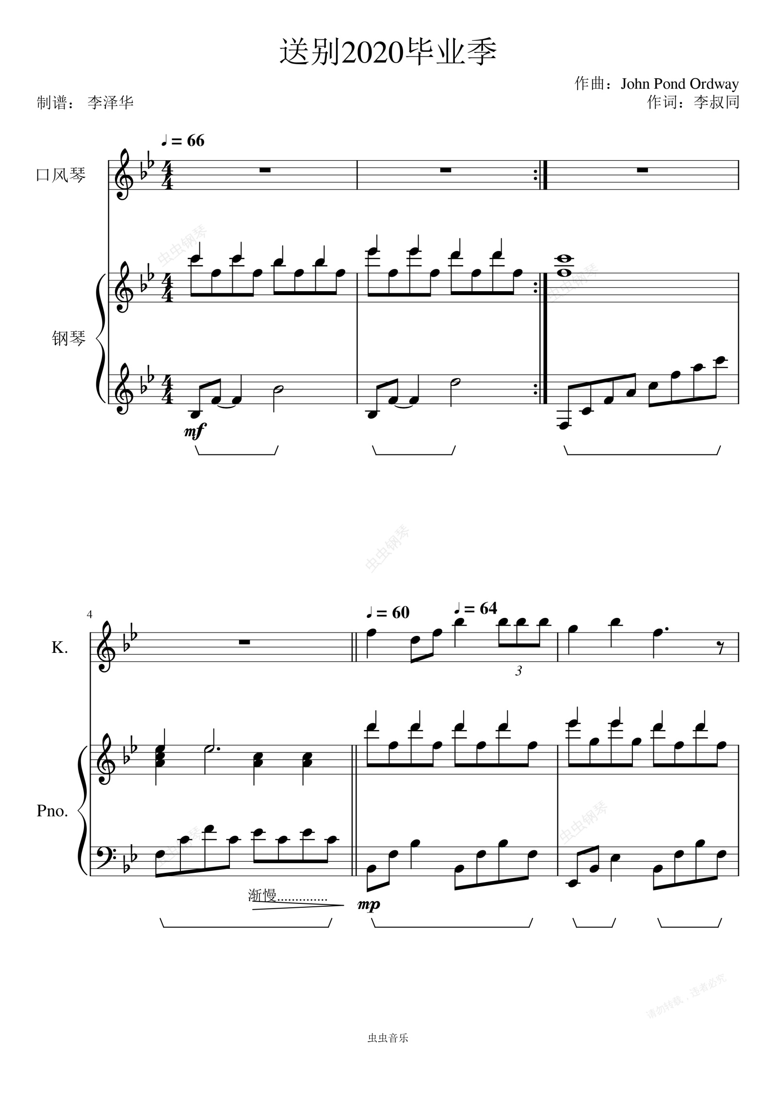 钢琴谱:送别(口风琴-钢琴)正版原谱