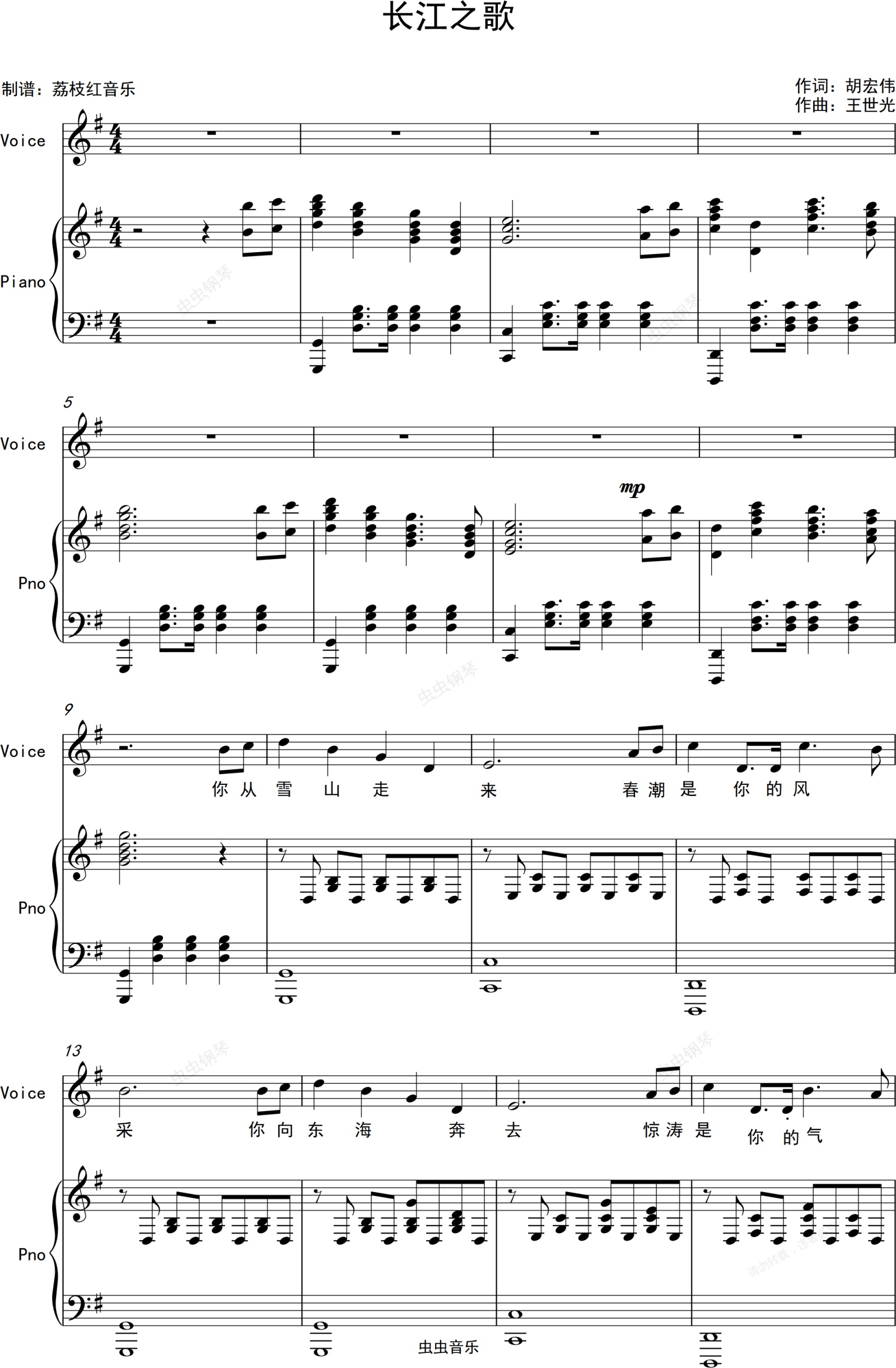 钢琴谱:长江之歌G调 带歌词弹唱版 钢琴谱