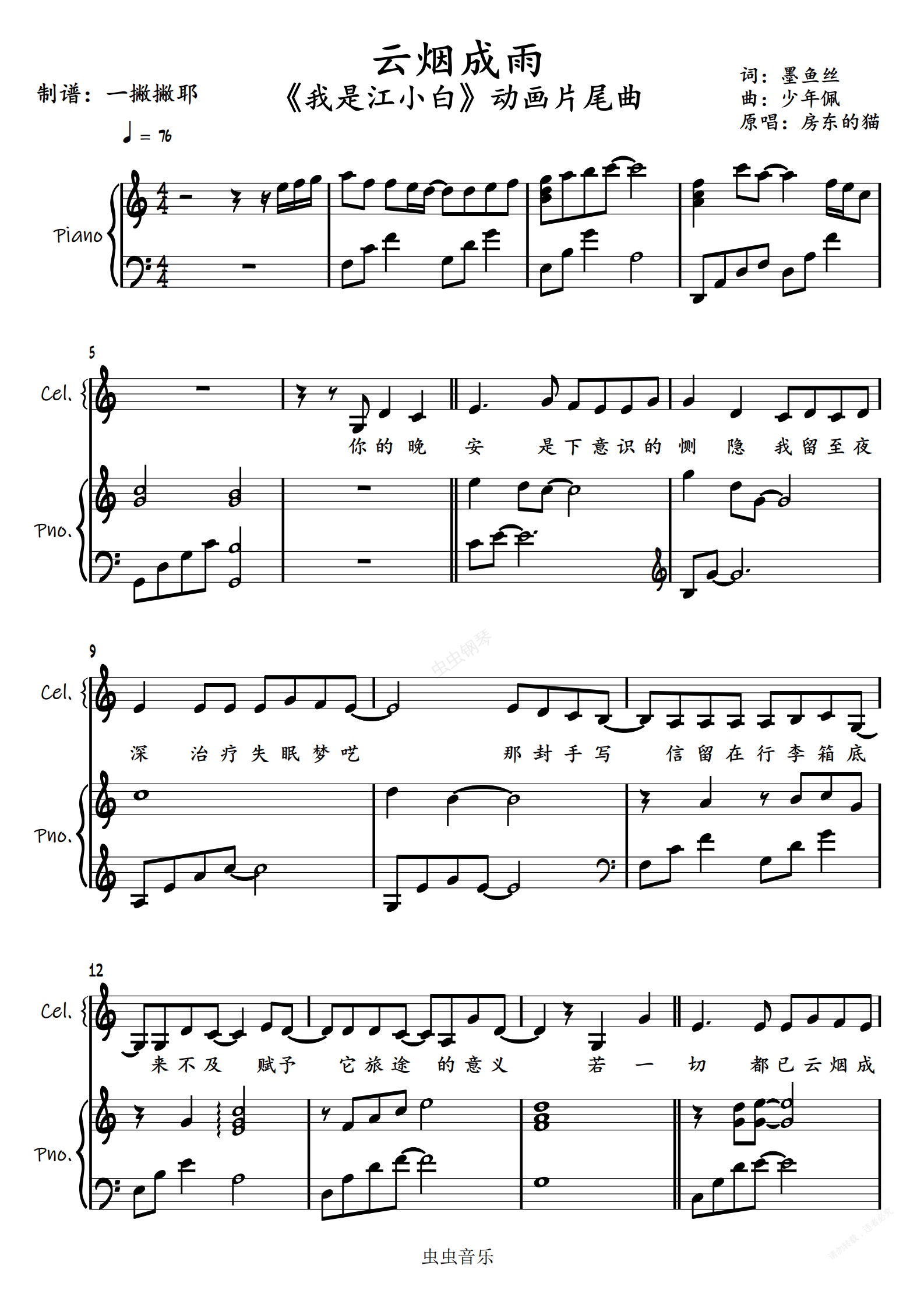 钢琴谱:云烟成雨【C调弹唱谱】房东的猫《我是江小白》「一撇撇耶」