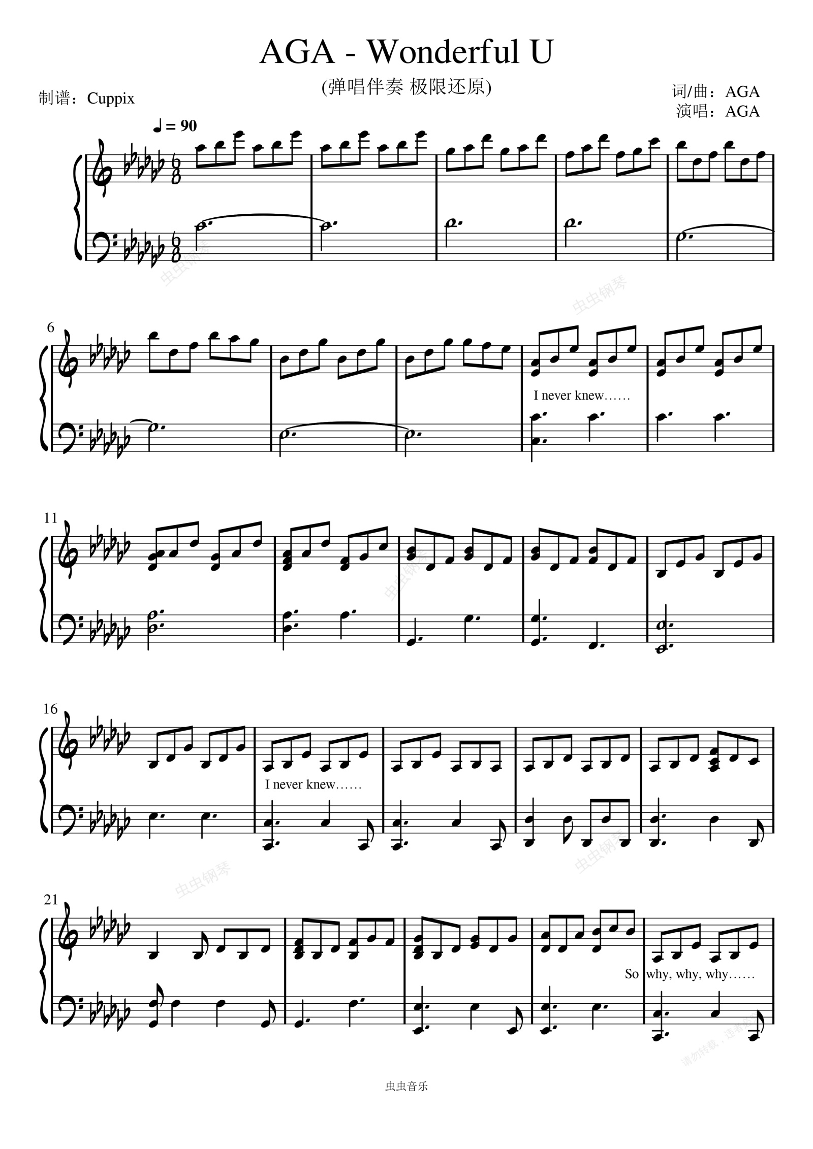 钢琴谱:AGA -《Wonderful U》弹唱伴奏 极限还原