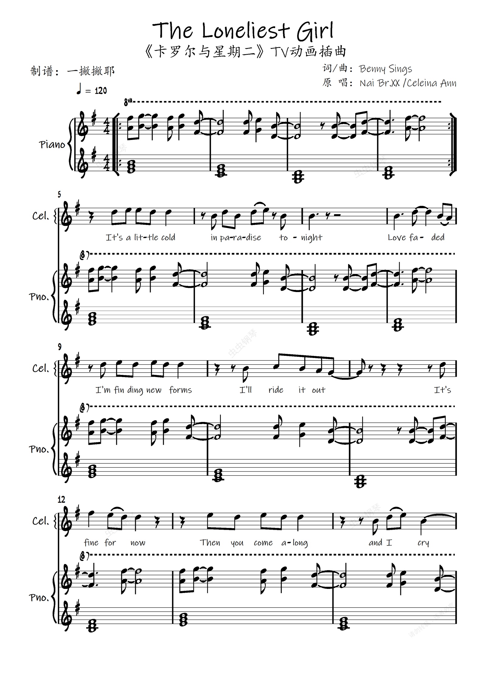 钢琴谱:The Loneliest Girl【弹唱谱】Nai Br.XX /Celeina Ann《卡罗尔与星期二》「一撇撇耶」
