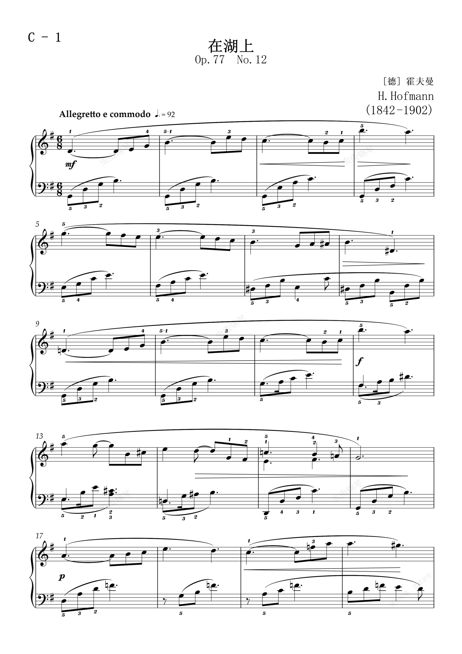 钢琴谱:【四级】C-1 在湖上 [带指法](2019新版钢琴考级)