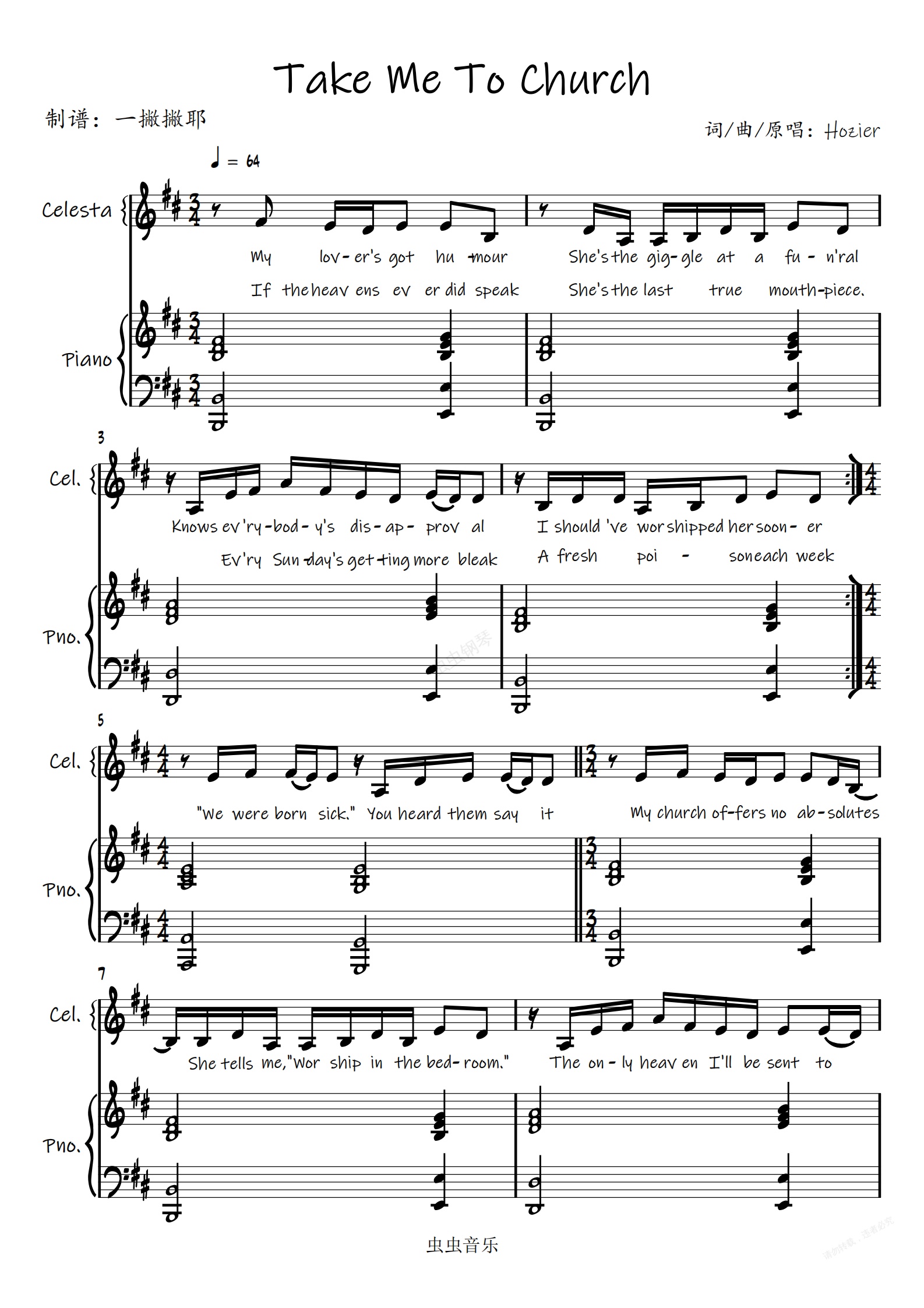 钢琴谱:【降调版弹唱谱】Take Me to Church-Hozier「一撇撇耶」