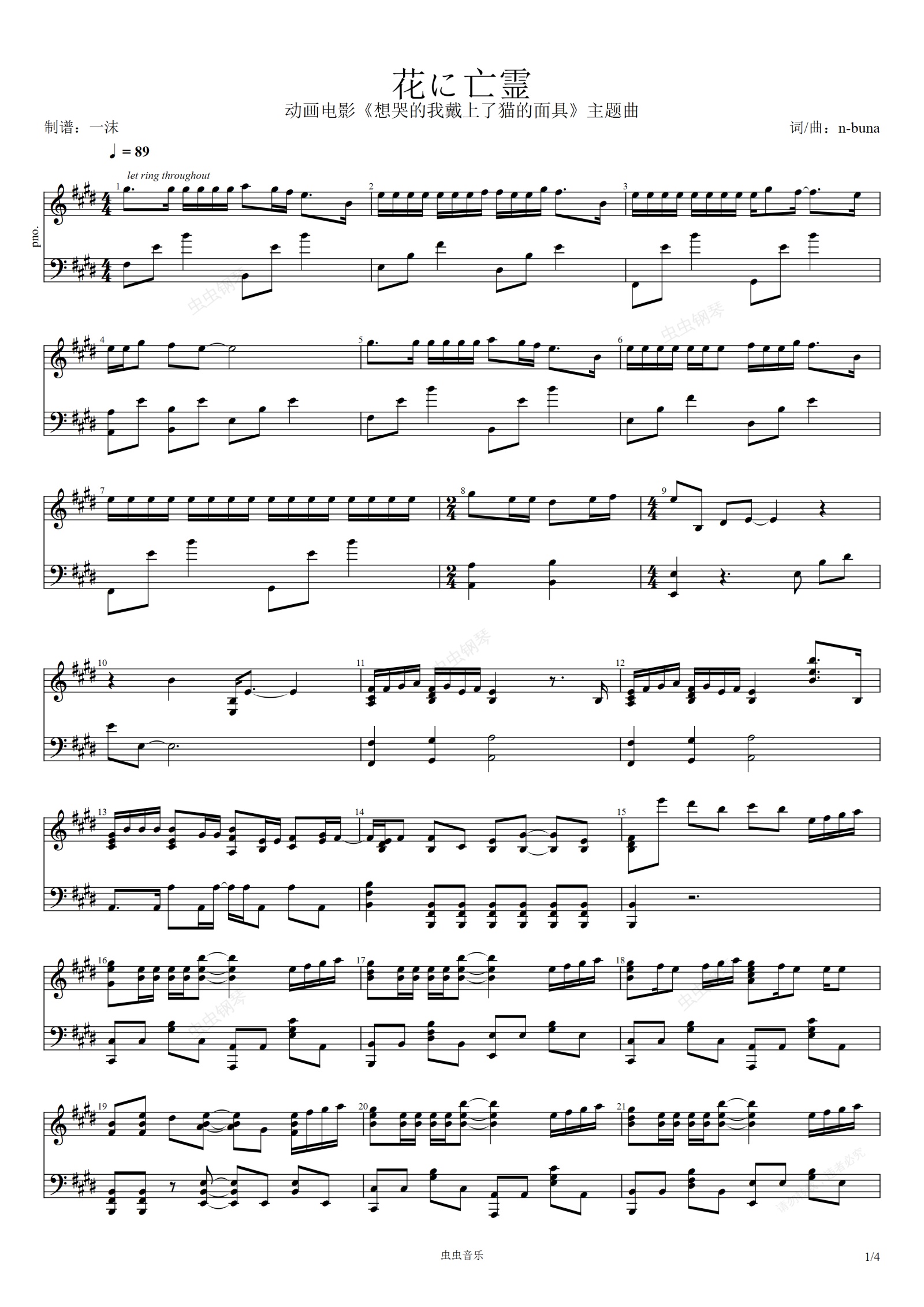 钢琴谱:花に亡霊(花上的亡灵)想哭的我带上了猫的面具 主题曲 钢琴独奏