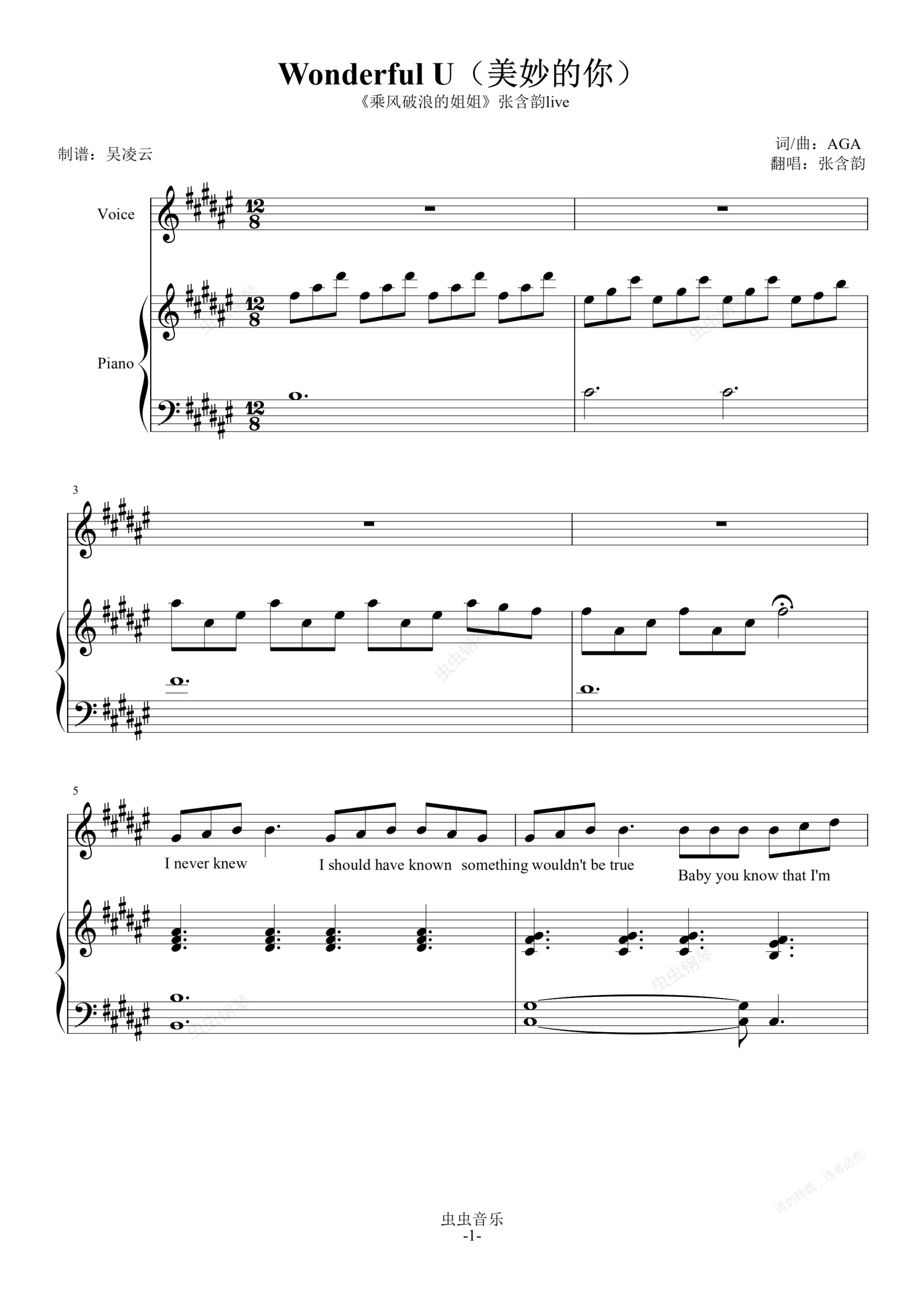 钢琴谱:Wonderful U(美妙的你)《乘风破浪的姐姐》张含韵钢琴弹唱版 吴凌云制谱 附歌词