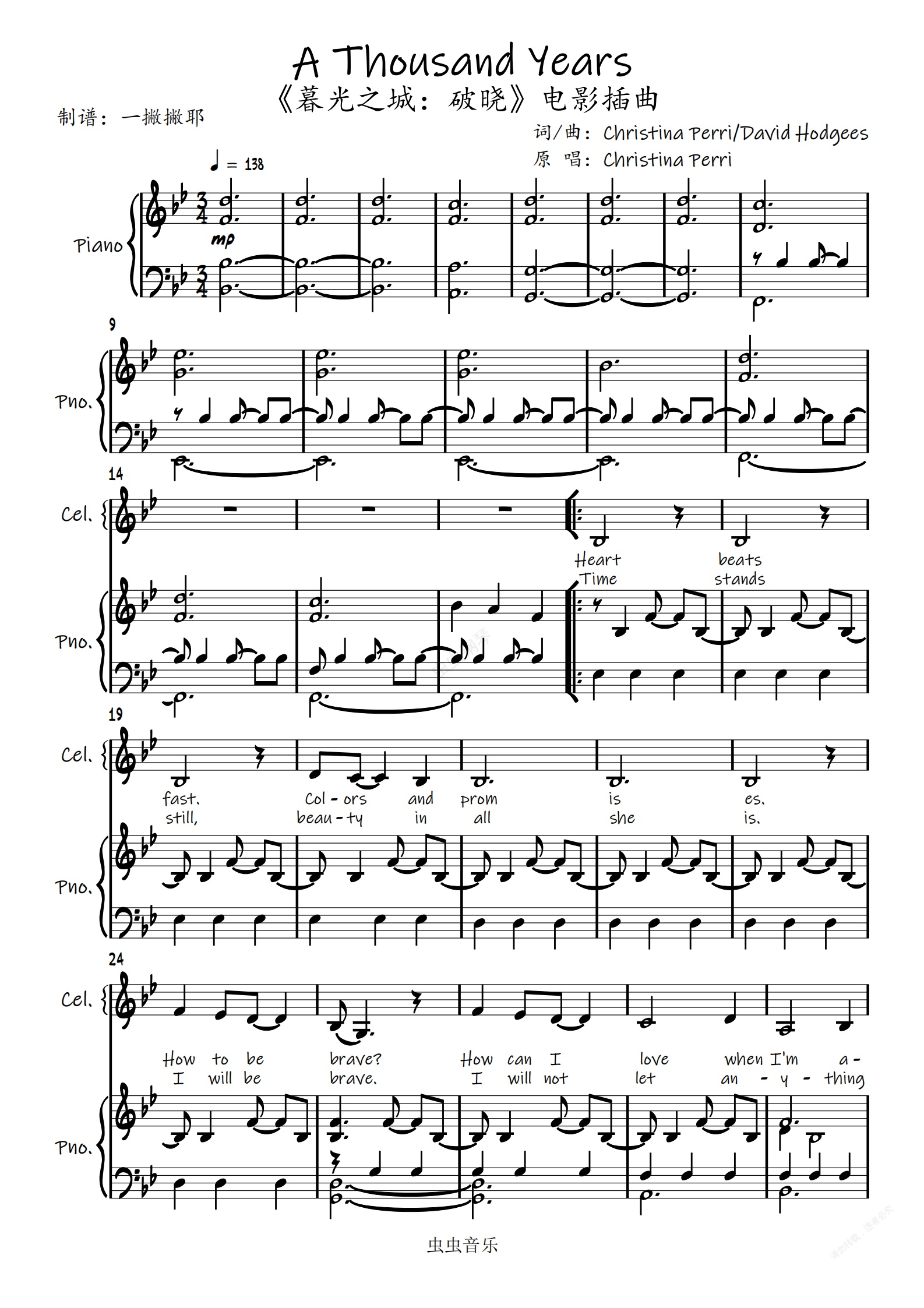 钢琴谱:A Thousand Years【弹唱谱】Christina Perri《暮光之城》「一撇撇耶」