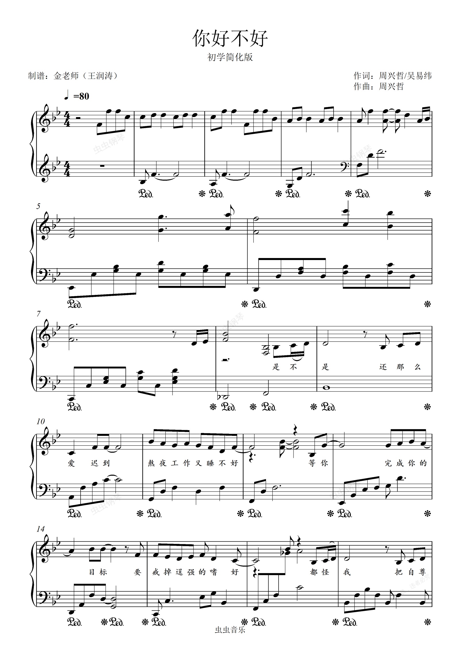 钢琴谱:你好不好-金老师独奏谱初学简化版