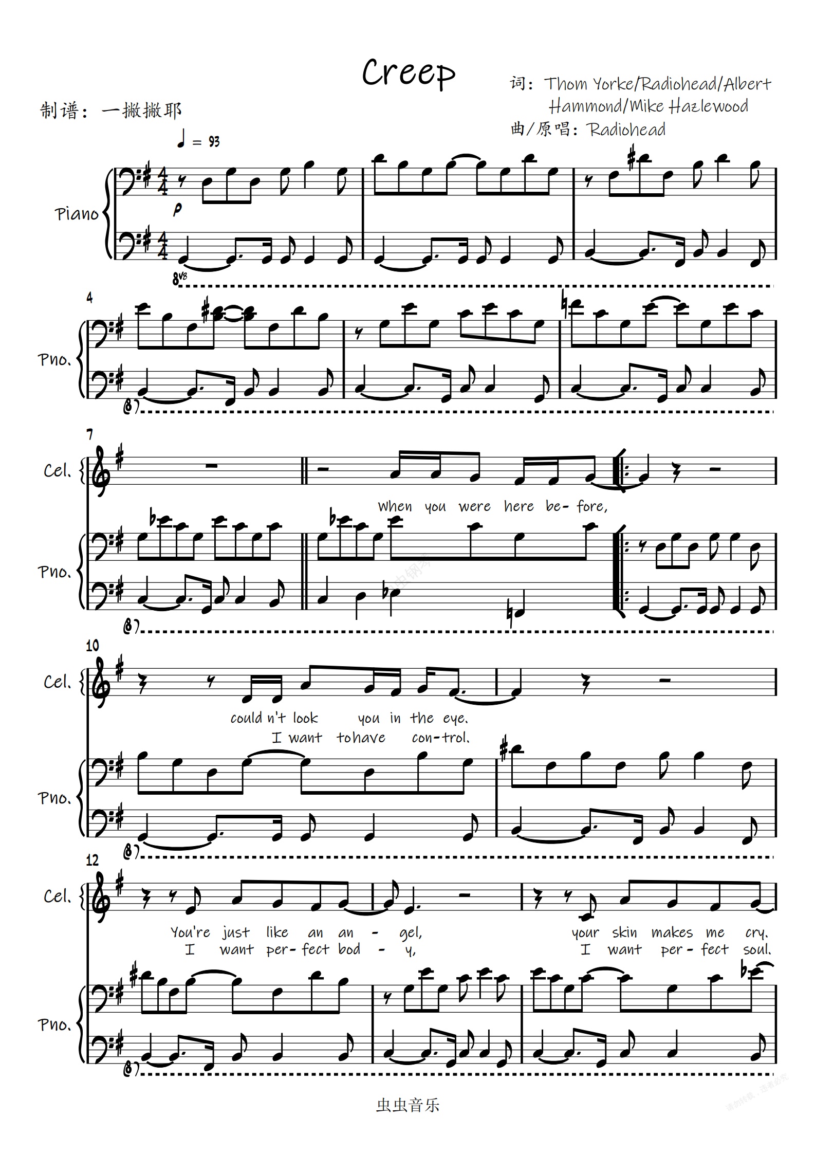 钢琴谱:Creep【弹唱谱】Radiohead电台司令「一撇撇耶」