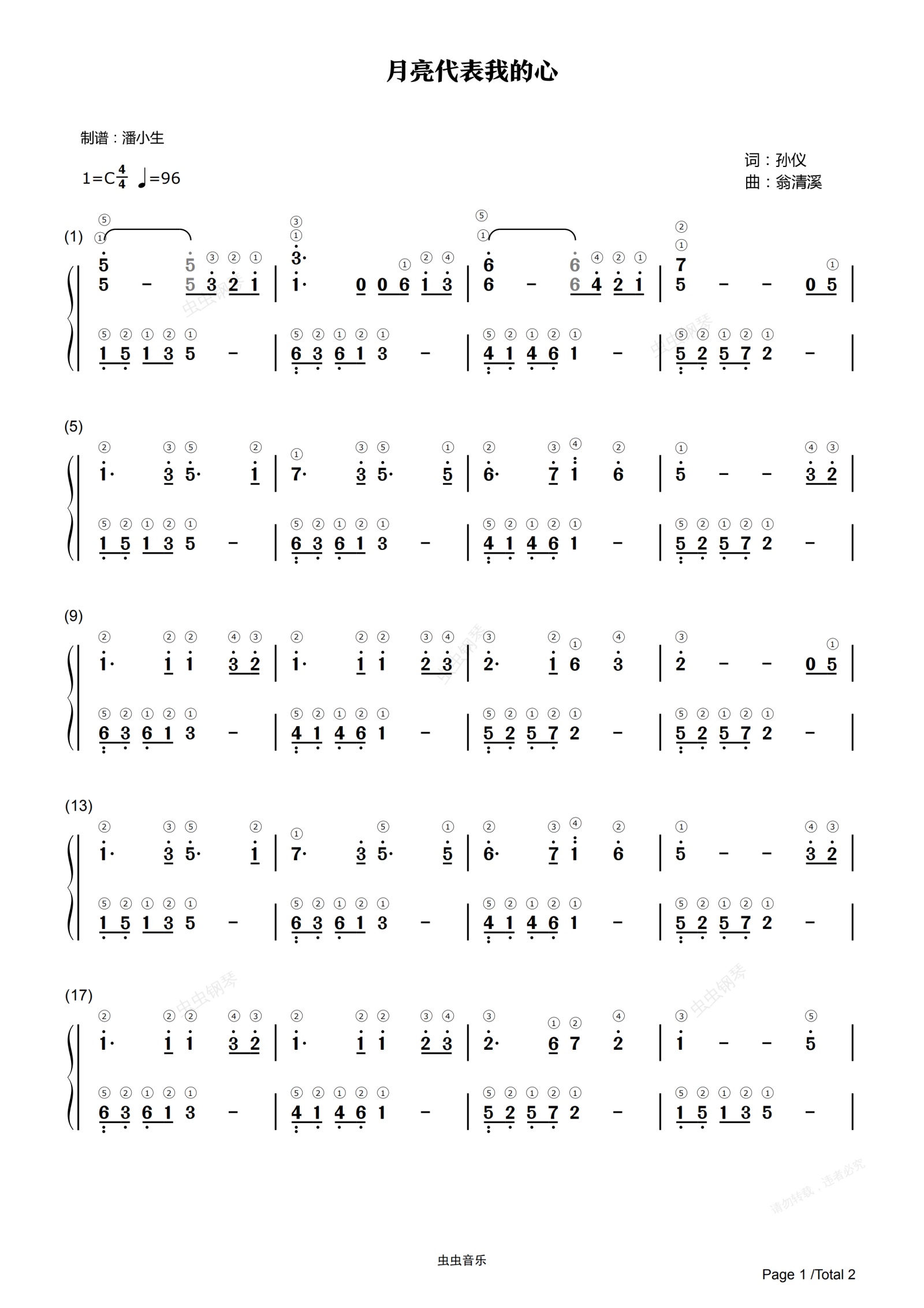 钢琴谱:[简谱] 月亮代表我的心 带指法 C调 简化版