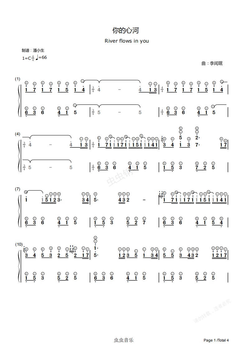 钢琴谱:[简谱] 你的心河 带指法 C调 简化版 River flows in you