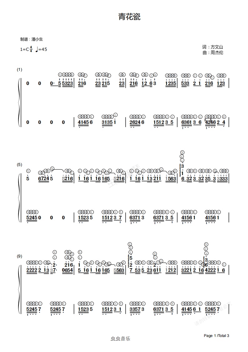钢琴谱:[简谱] 青花瓷 带指法 C调 简化版 周杰伦