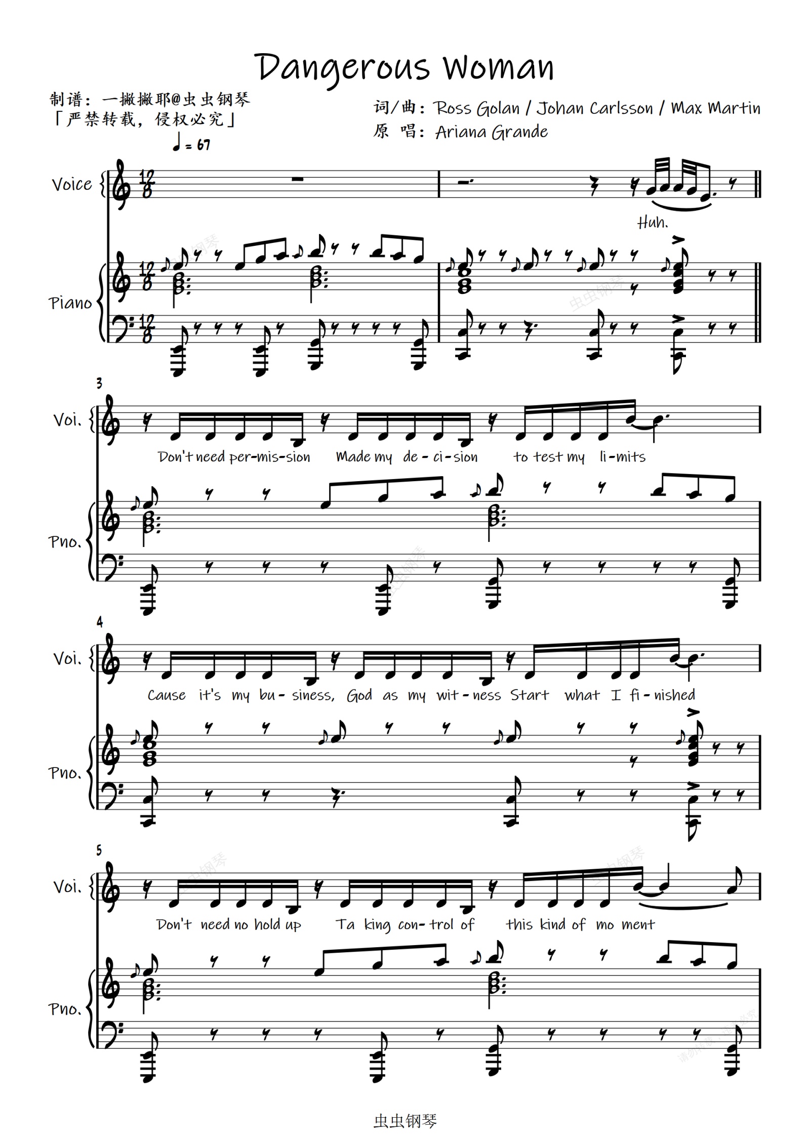 钢琴谱:【弹唱谱】Dangerous Woman-Ariana Grande「一撇撇耶」