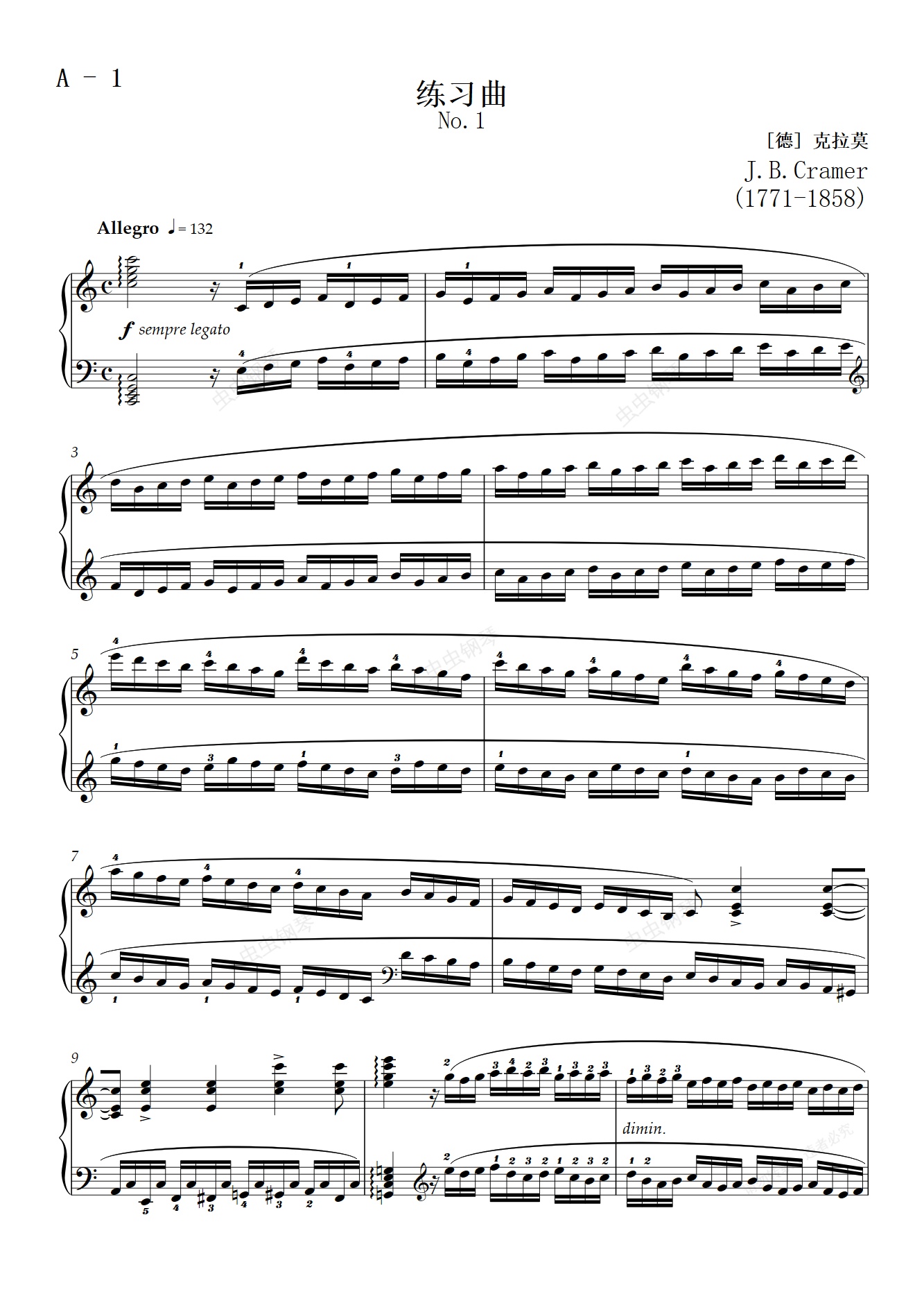 钢琴谱:【六级】A-1 练习曲 [带指法](2019新版钢琴考级)