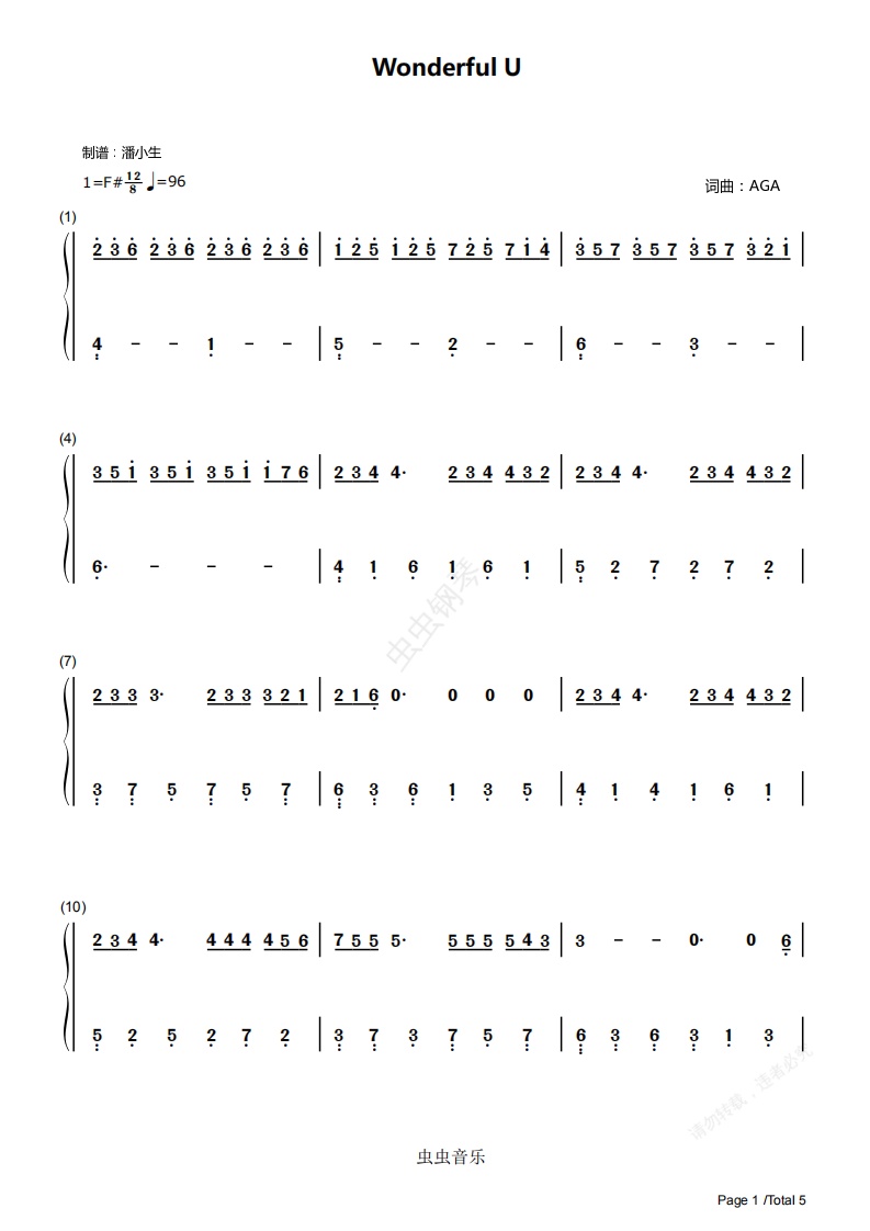 钢琴谱:[双手简谱] Wonderful U 独奏 AGA 《乘风破浪的姐姐》张含韵版 美妙的你
