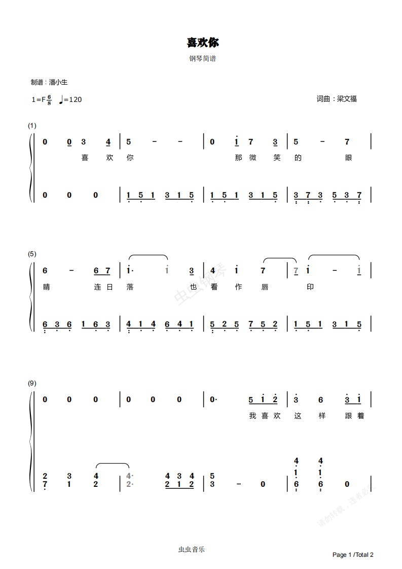 钢琴谱:[双手简谱] 喜欢你 希林娜依·高 版本 创造营2020 F调 简易版