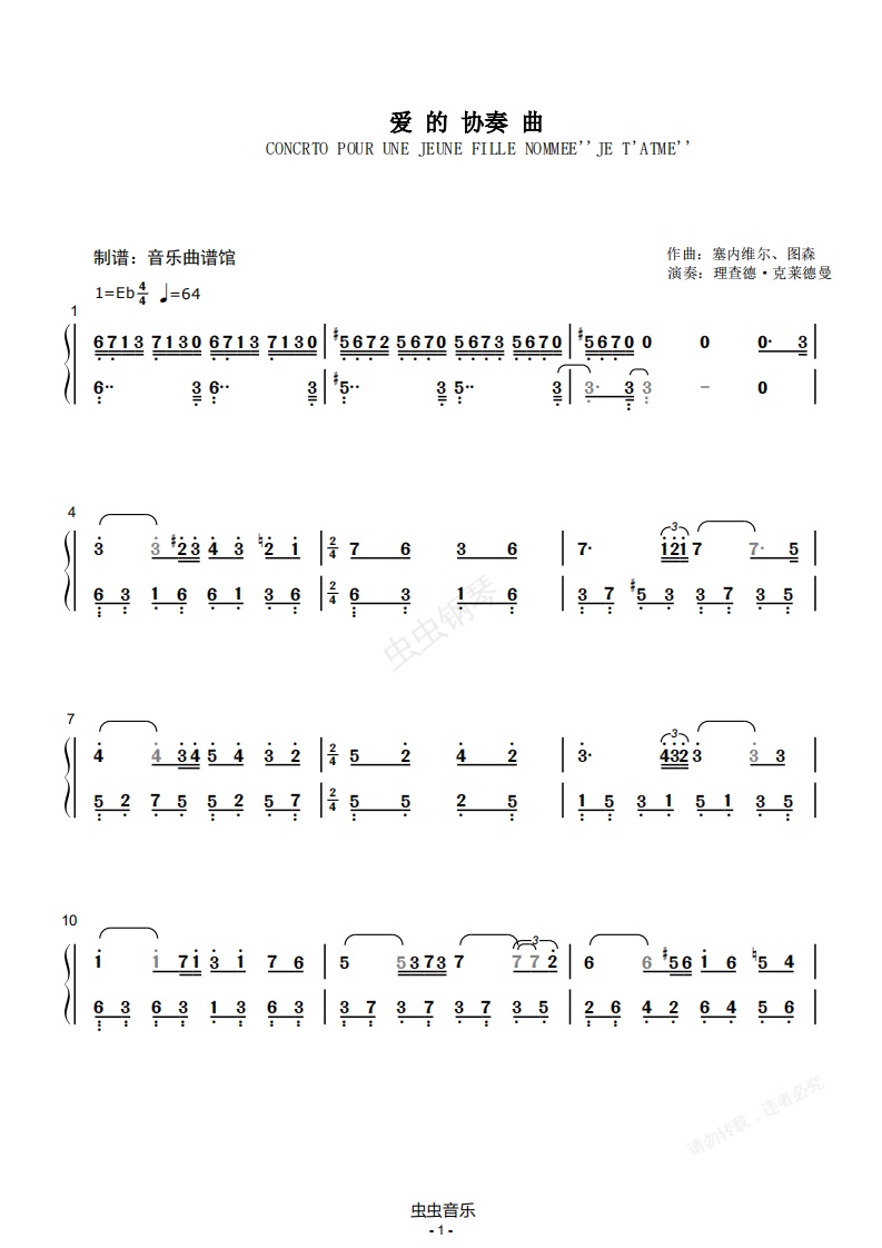钢琴谱:爱的协奏曲-【简谱】(CONCERTO POUR UNE JEUNE FILLE NOMMEE “JE T`AIME” 理查德·克莱德曼)