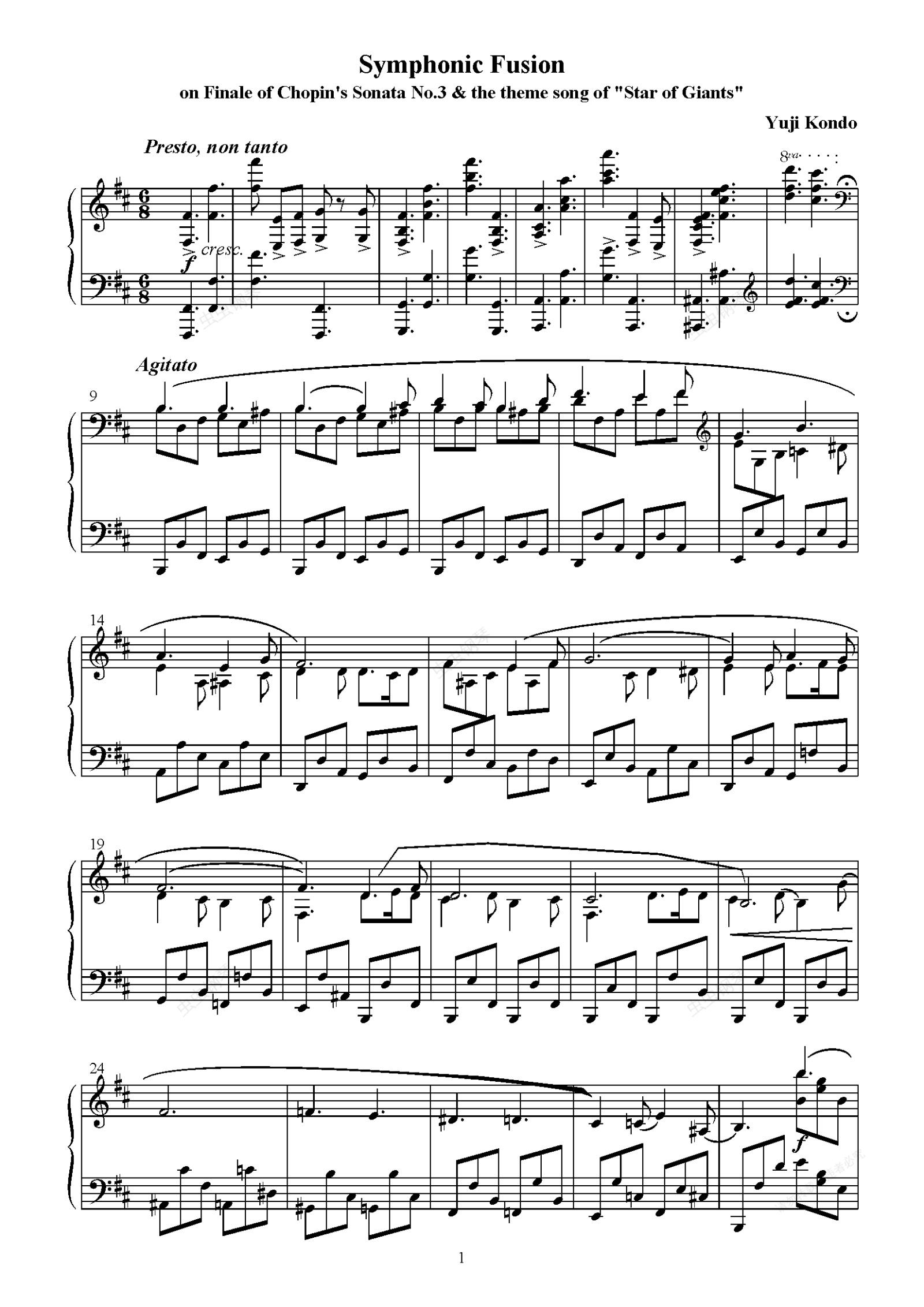 肖邦b小调第三奏鸣曲是肖邦与乔治桑在一起的时候创作的曲子,本身融合了肖邦很多的跑动技术,难度非常高。戈多夫斯基的日本远房亲戚的后人(开玩笑的)Yuji Konde先生对于肖邦第三奏鸣曲第四乐章的改编,使得这首奏鸣曲与一首日本早期棒球动画《巨人之星》融合,使得这首曲子有着神奇的魔力。当然除了压缩了篇幅之外,也把这个乐章也改难了一些。这首曲子是彻彻底底的演奏级别难度,想挑战一下的朋友可以试一下