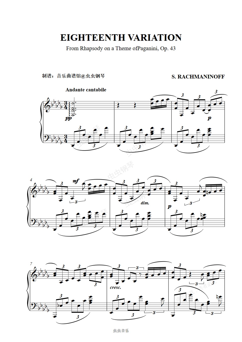 钢琴谱:帕格尼尼主题狂想曲第十八变奏【钢琴独奏原版】(Rhapsody on a Theme of Paganini Op.43 拉赫曼尼诺夫似曾相识 Somewhere in Time 时光倒流七十年谢尔盖·瓦西里耶维奇·拉赫玛尼诺夫 )