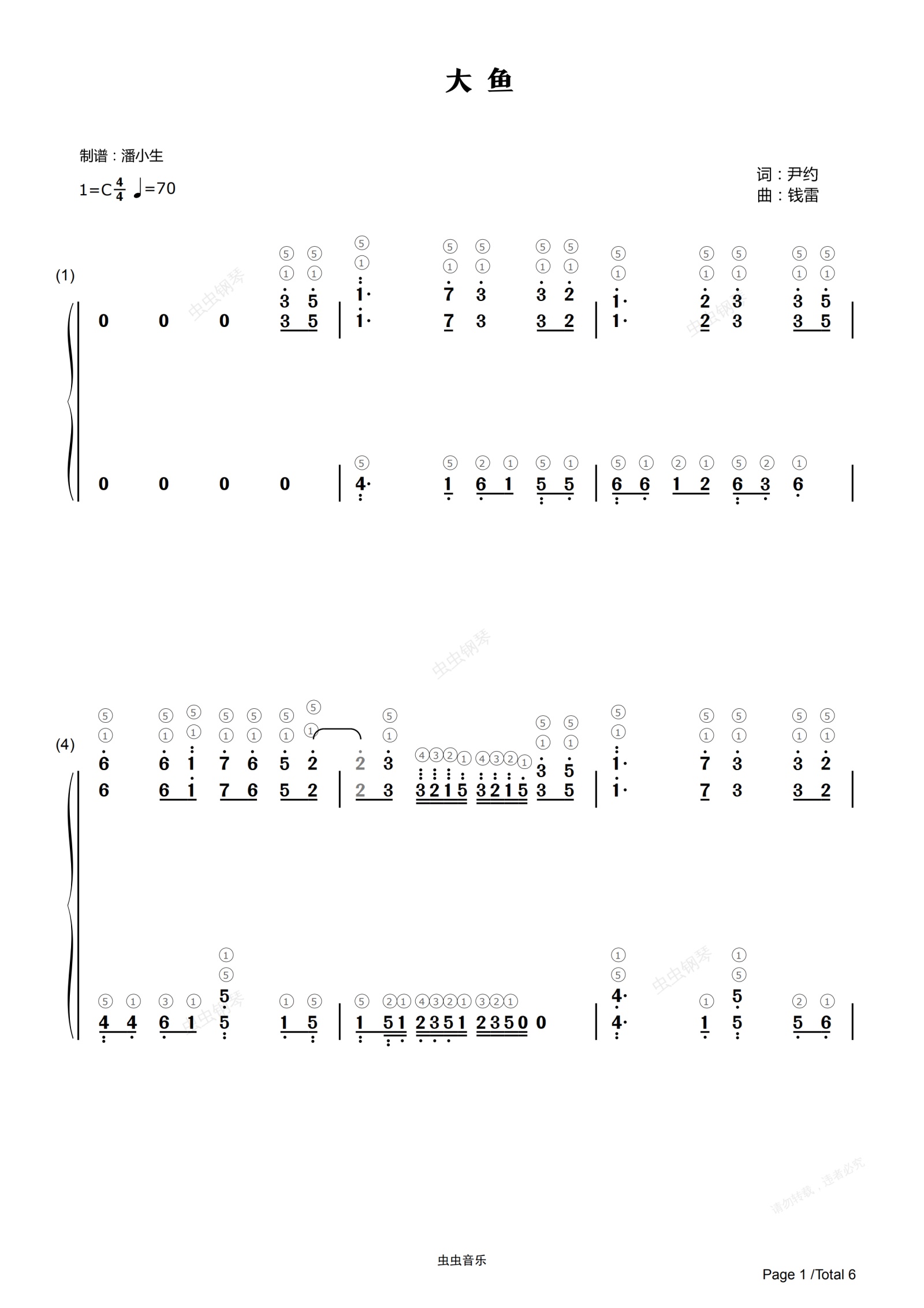 钢琴谱:[双手简谱] 大鱼 带指法 C调 《大鱼海棠》印象曲