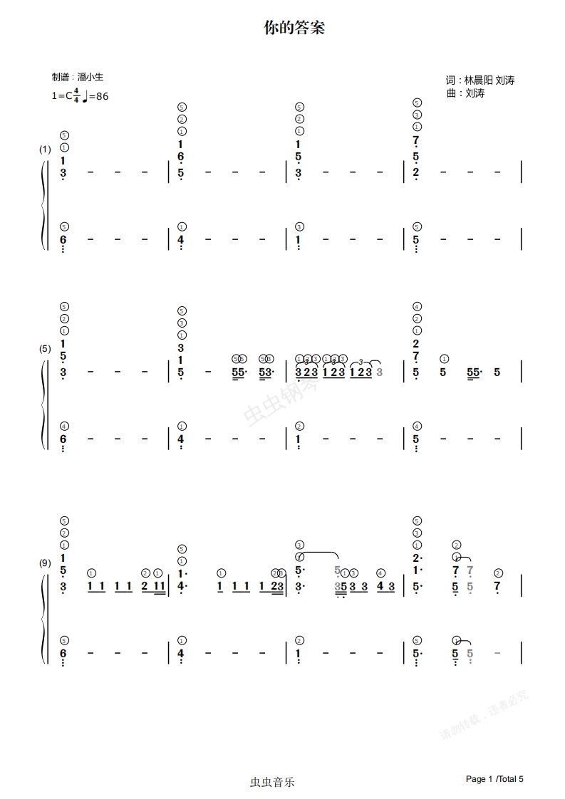 钢琴谱:[双手简谱] 你的答案 带指法 C调 简化版