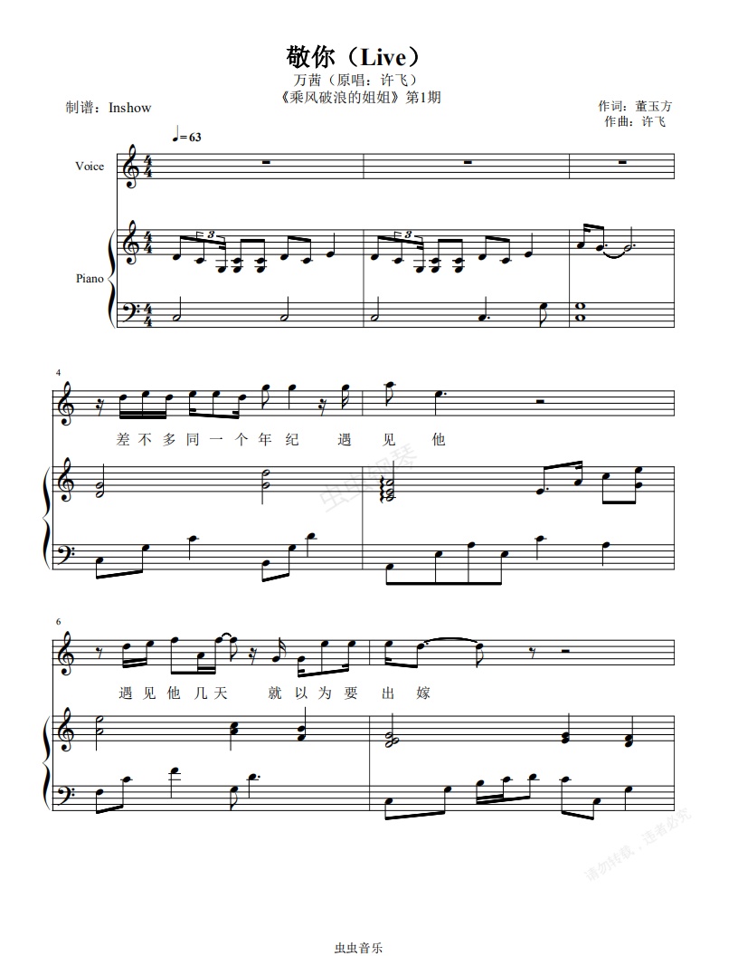 钢琴谱:敬你【C调】(乘风破浪的姐姐)