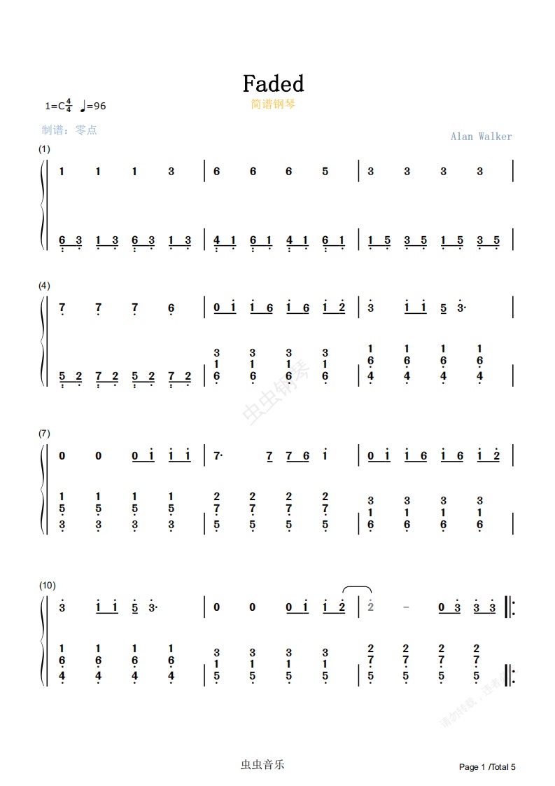 钢琴谱:Faded-双手简谱