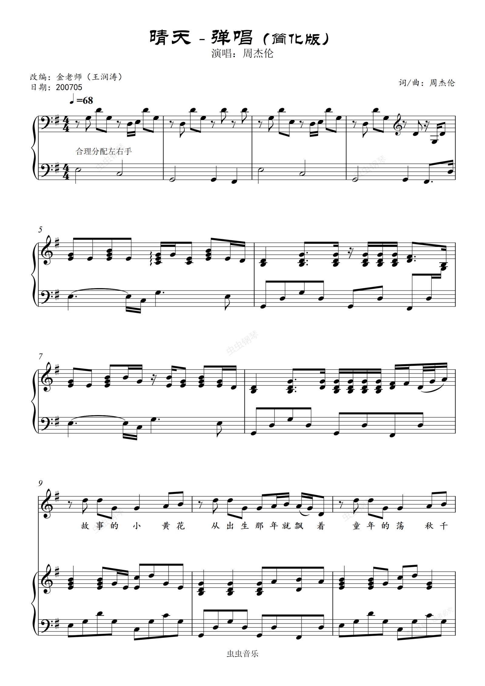 钢琴谱:晴天-金老师弹唱谱(简化版)