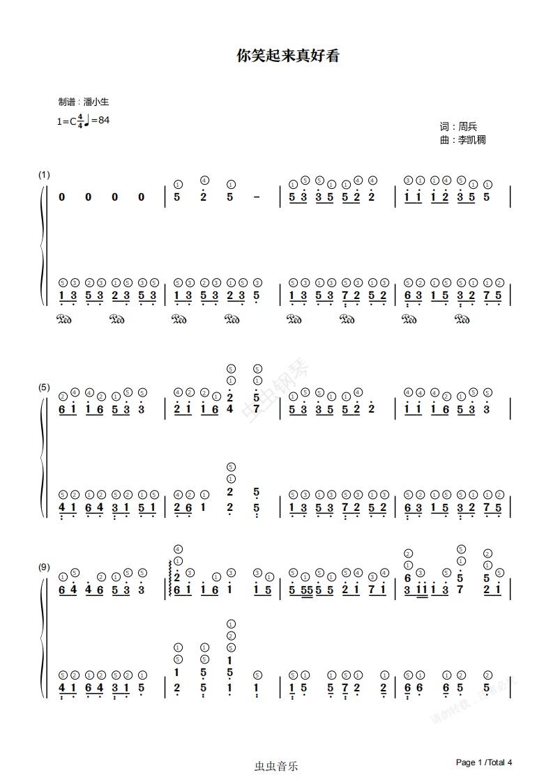 钢琴谱:[双手简谱] 你笑起来真好看 带指法 C调