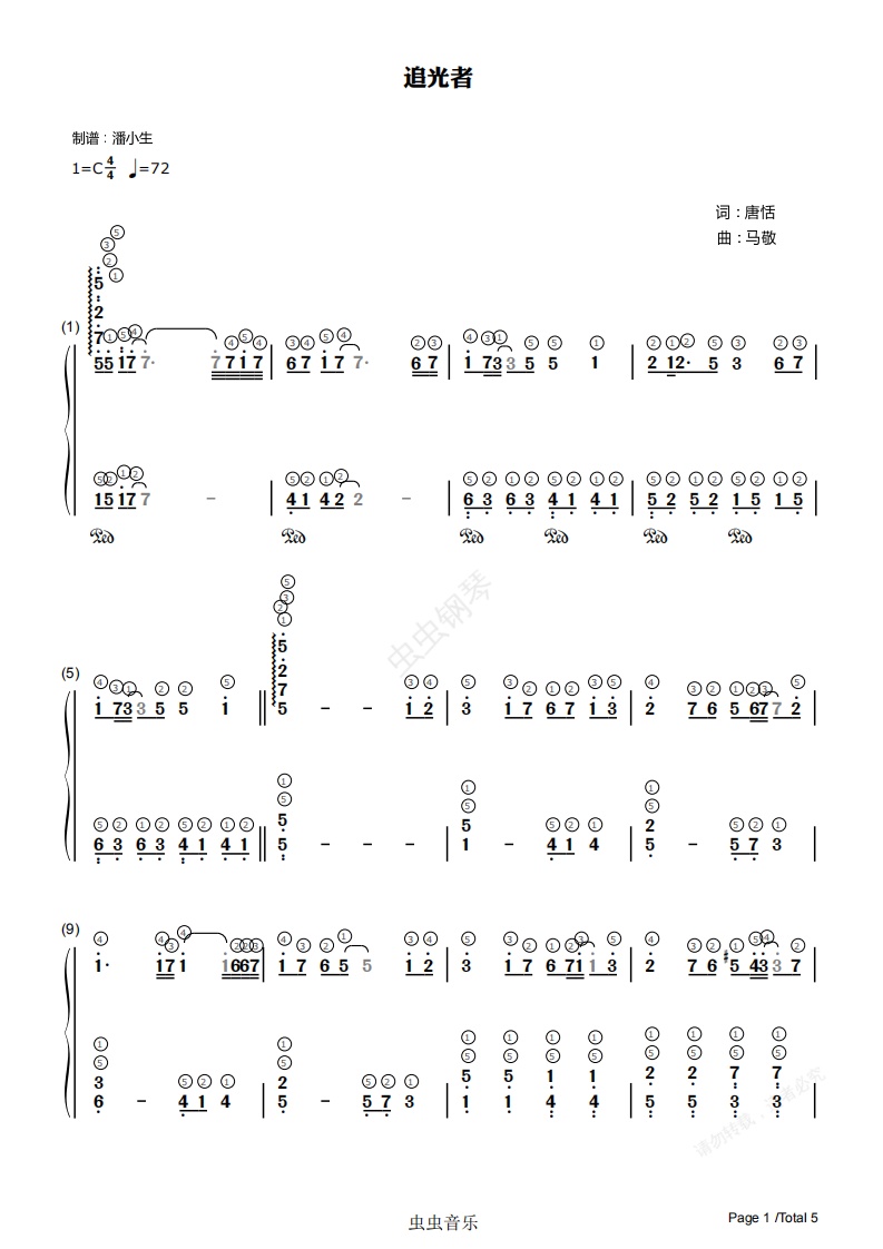 钢琴谱:[双手简谱] 追光者 带指法 C调